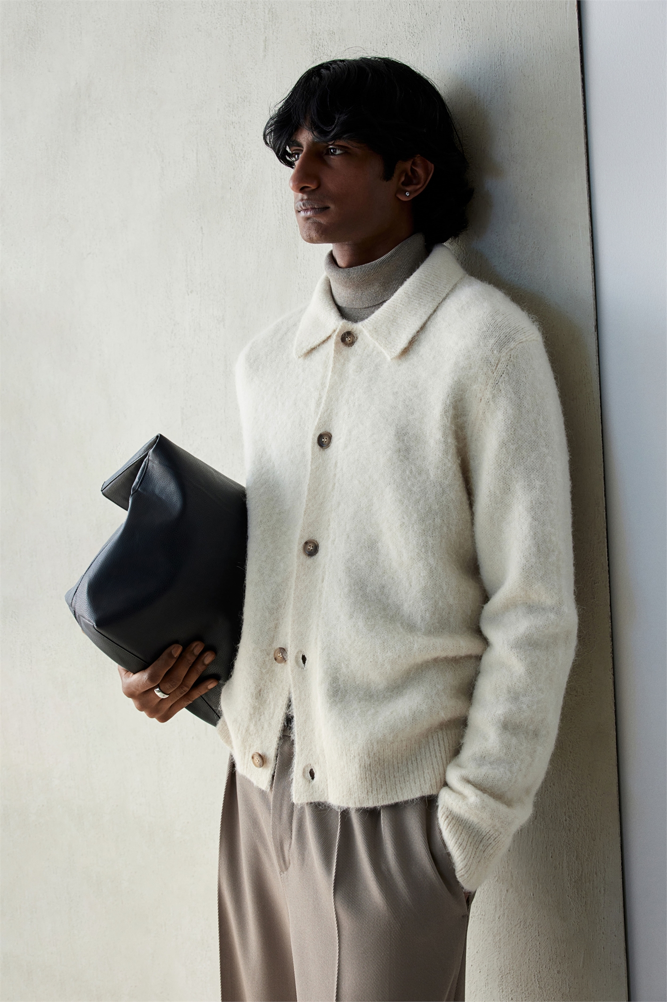 Кардиган из шерстяного микса с воротником, застежкой на пуговицы спереди и длинными рукавами. Ребристые манжеты и подол. Регулярный крой для комфортной носки и классического силуэта.