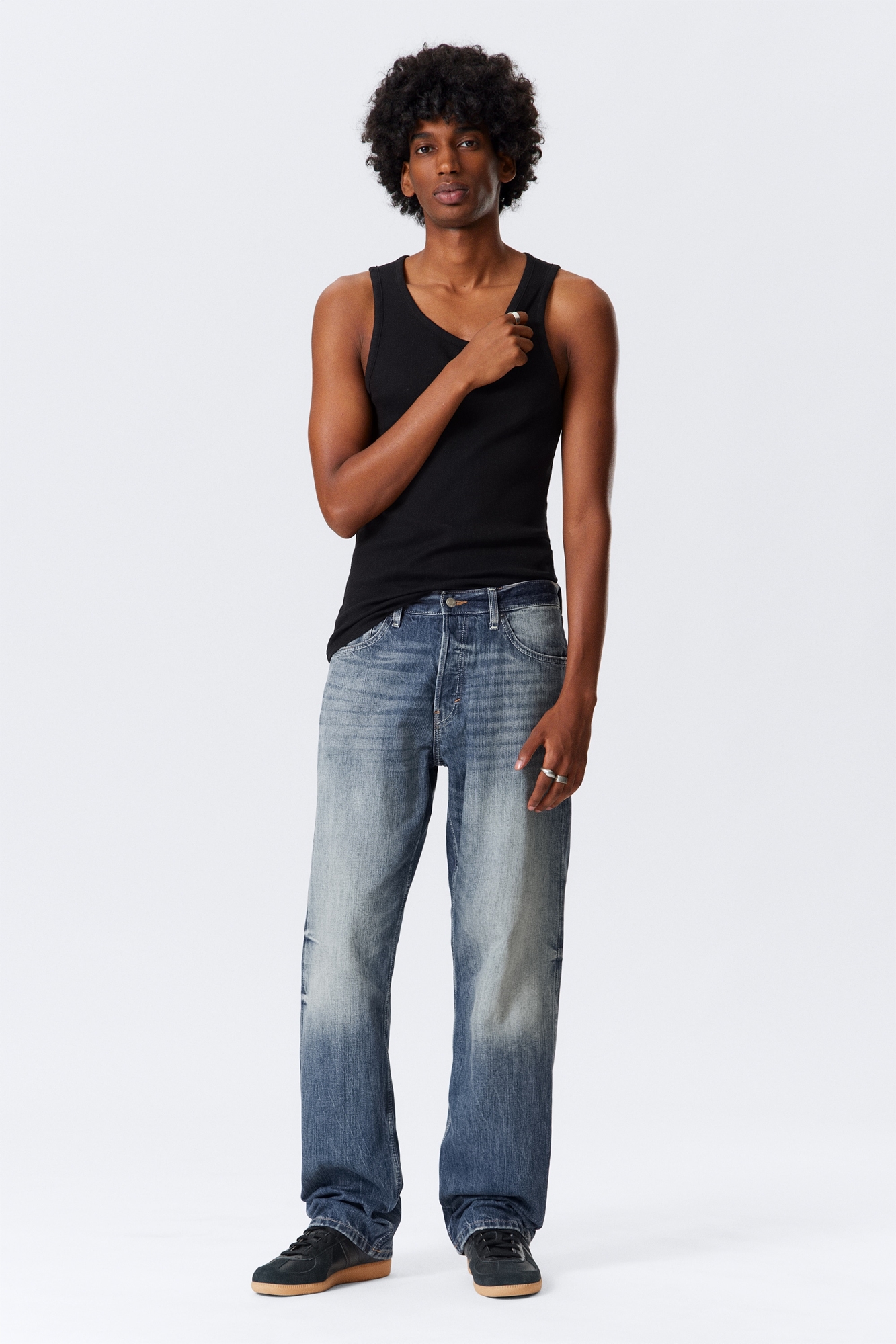 Джинсы унисекс со средней посадкой, прямыми штанинами и длинными штанинами. Джинсы изготовлены из жесткого денима из органического хлопка с добавлением переработанного хлопка. Они имеют классический дизайн с 5 карманами и застежку на пуговицу.