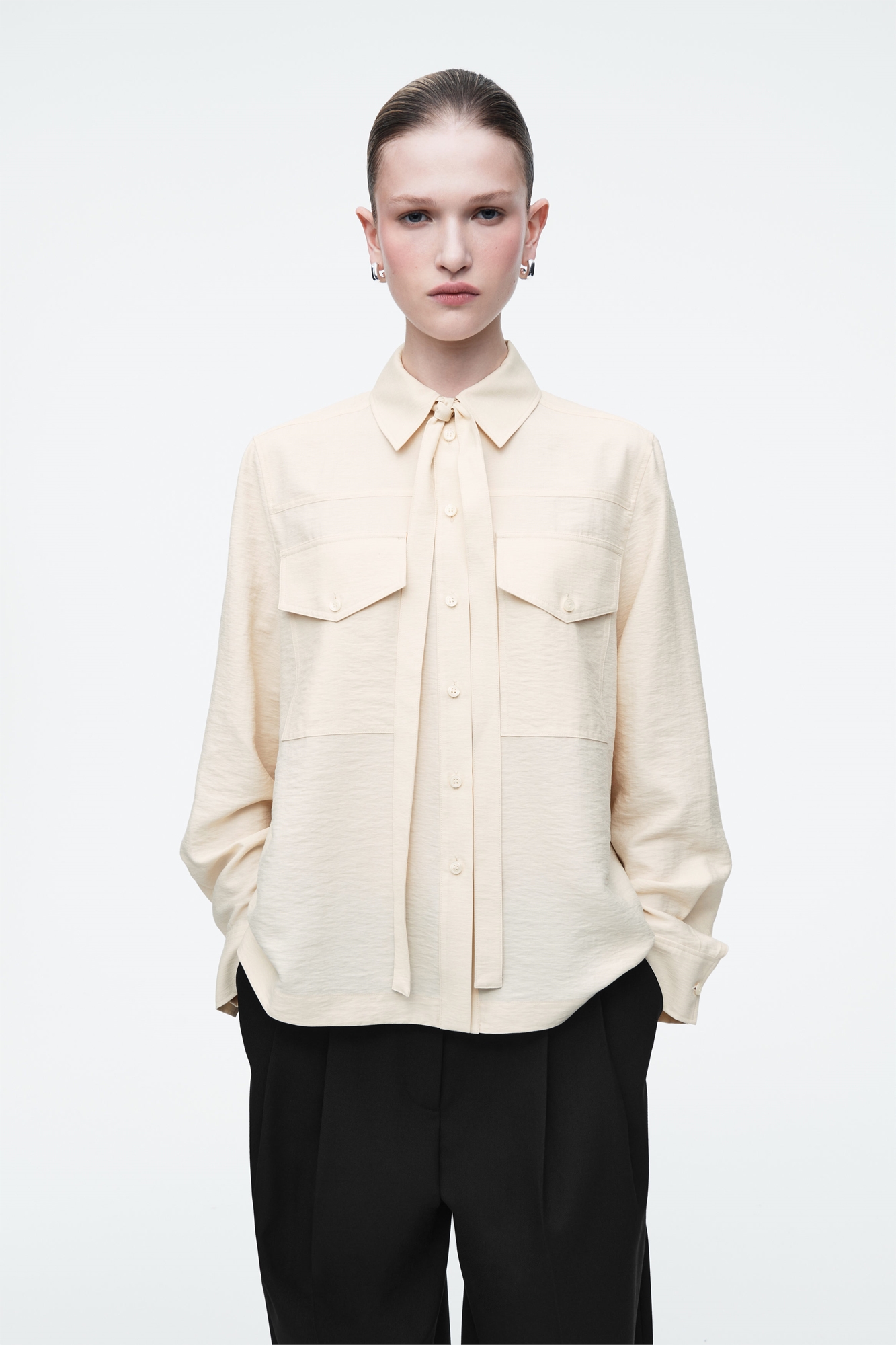 В этом сезоне команда женской одежды переосмыслила утилитарные вещи через призму изысканности. Эта рубашка модернизирована тонким шарфом, который аккуратно завязывается вокруг воротника, и оформлена тональной строчкой и нагрудными карманами, чтобы сохранить классический вид. Складки на манжетах и сзади придают ей форму. Регулярный крой Застежка на пуговицы TENCEL™ является торговой маркой Lenzing AG. TENCEL™ Lyocell производится из возобновляемых древесных источников с использованием процесса, в котором перерабатывается 99% всех химических веществ и воды Оболочка: 90% TENCEL™ Lyocell, 10% полиамид. Без учета отделки / Машинная стирка Длина по спинке для размера EU 36 составляет 66 см / Модель носит размер EU 36