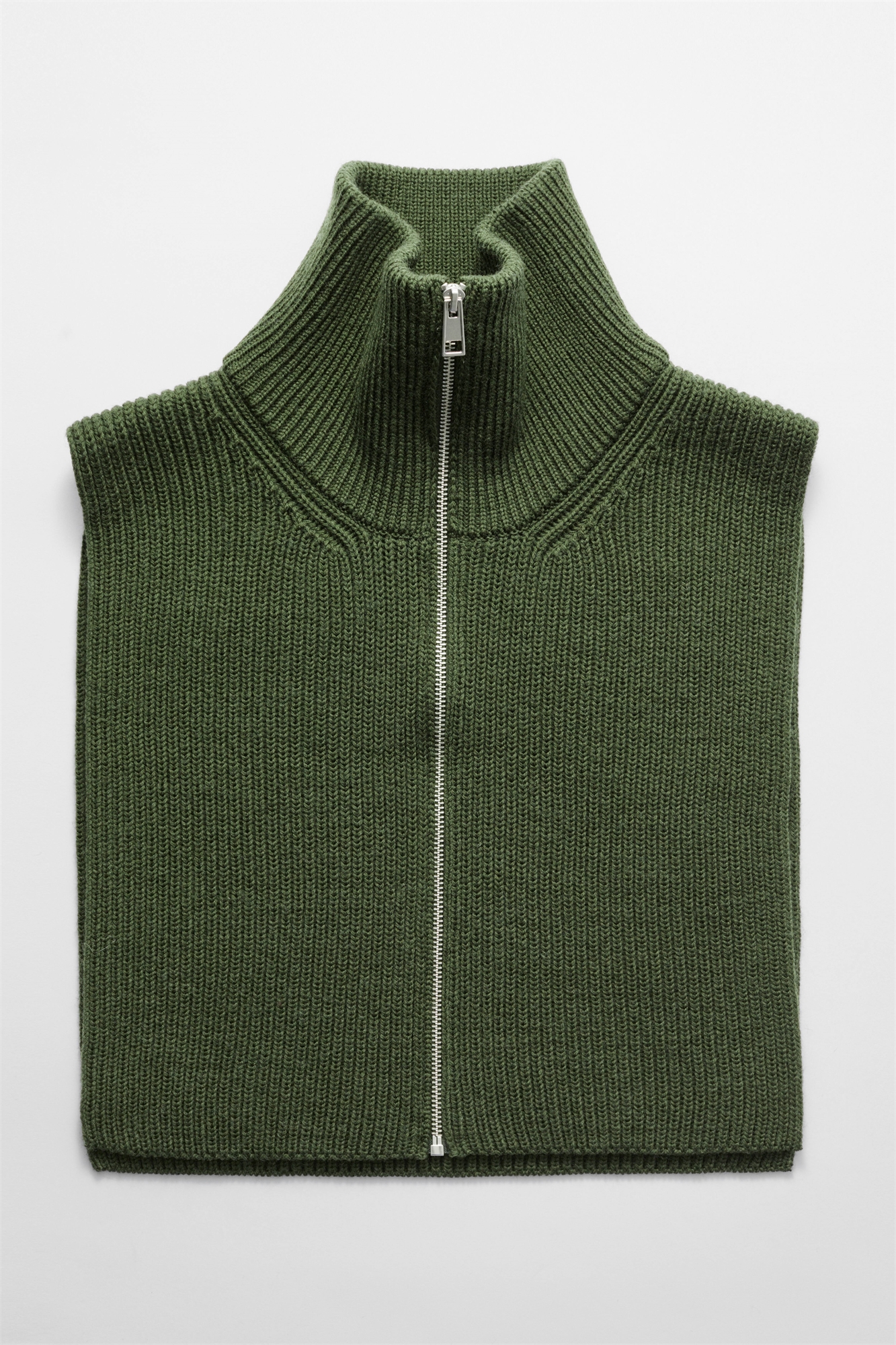 Воротник из мягкой смеси шерсти и хлопка с ребристой фактурой, обеспечивающей плотное прилегание. Застегните молнию с серебристой отделкой, чтобы сделать из него воронку.