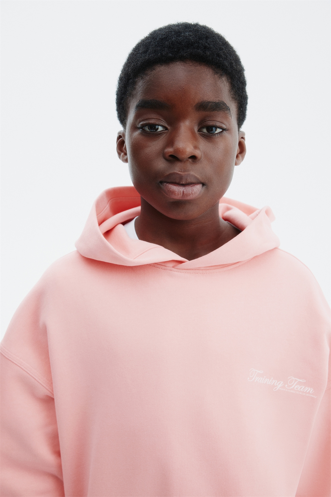 Спортивная толстовка свободного покроя из хлопкового толстовочного материала с капюшоном на подкладке, спущенными плечами и длинными рукавами. Карман-кенгуру и широкая тесьма на манжетах и подоле.