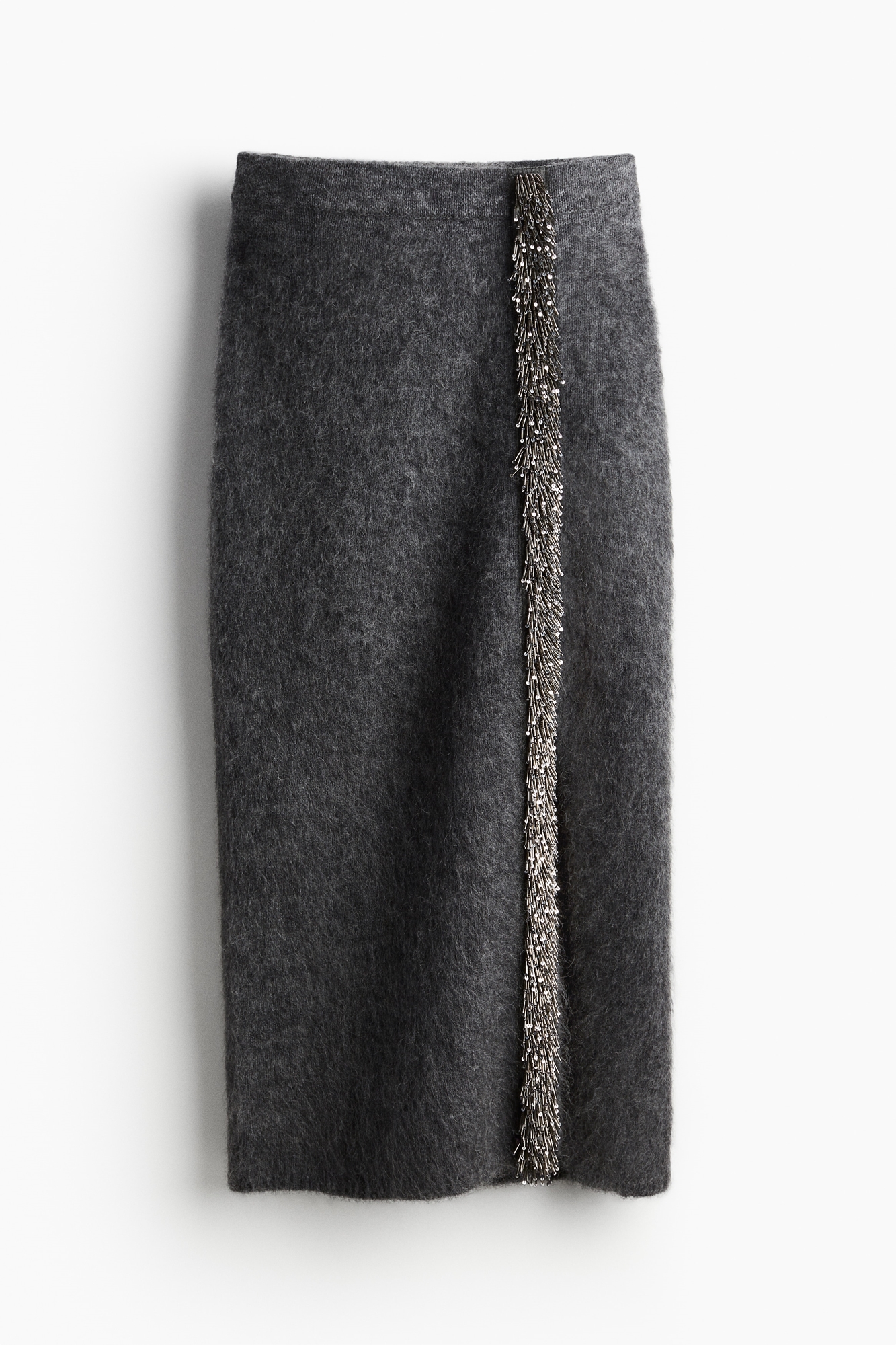 Юбка длиной до колена из мягкого трикотажа с добавлением мохера и шерсти. Регулярная талия с закрытой резинкой и разрез из струящейся бахромы с пайетками и стеклярусом по одной стороне спереди, заканчивающийся разрезом.