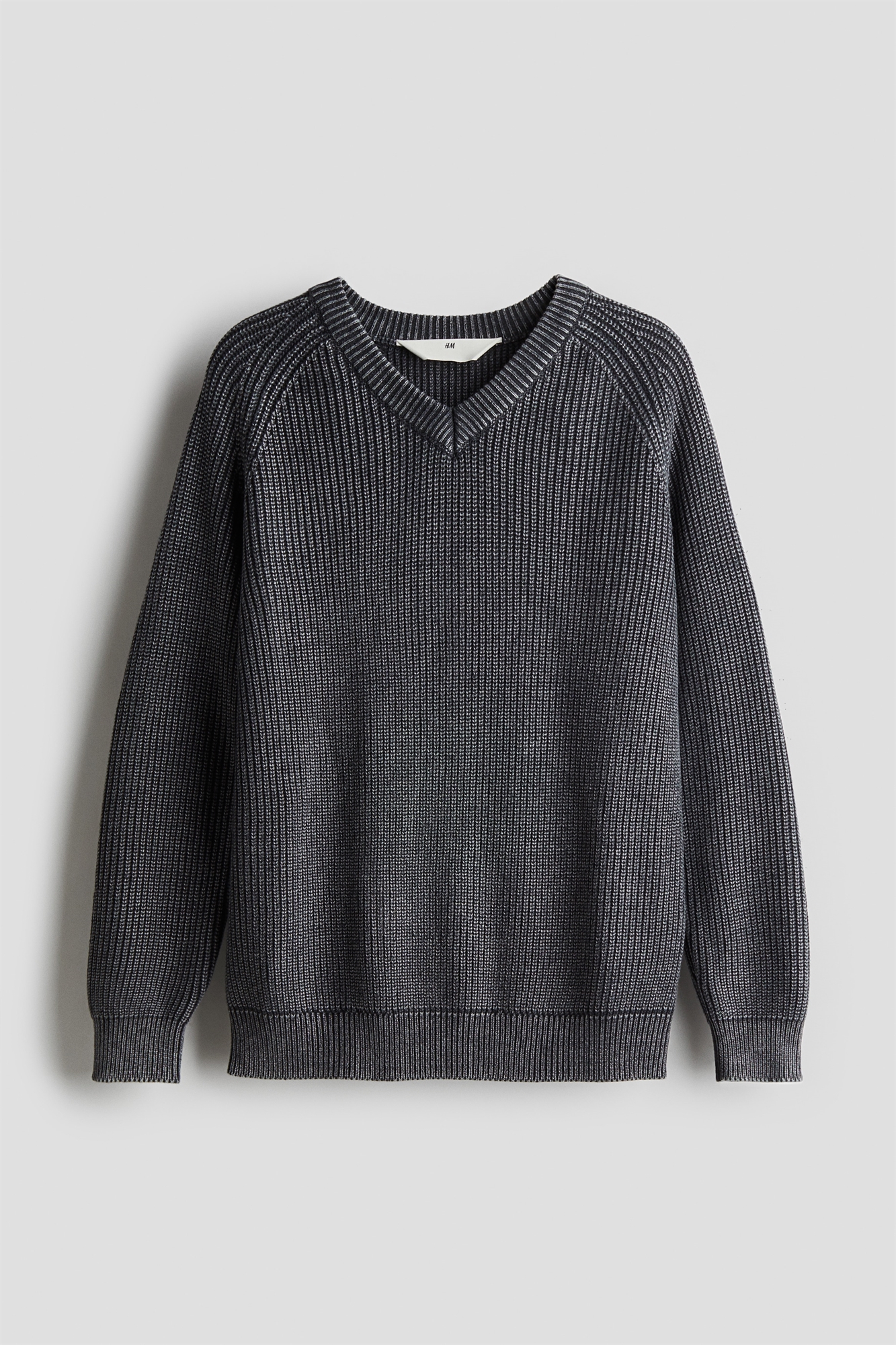 Джемпер из мягкого трикотажа в рубчик с V-образным вырезом, длинными рукавами реглан и рубчиками на манжетах и подоле.