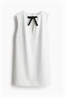 Короткое платье без рукавов из эластичного полотна с круглым вырезом и V-образной проймой с декоративным бантом, украшенным бисером, спереди. Скрытая застежка-молния и застежка-крючок сзади. Без подкладки.