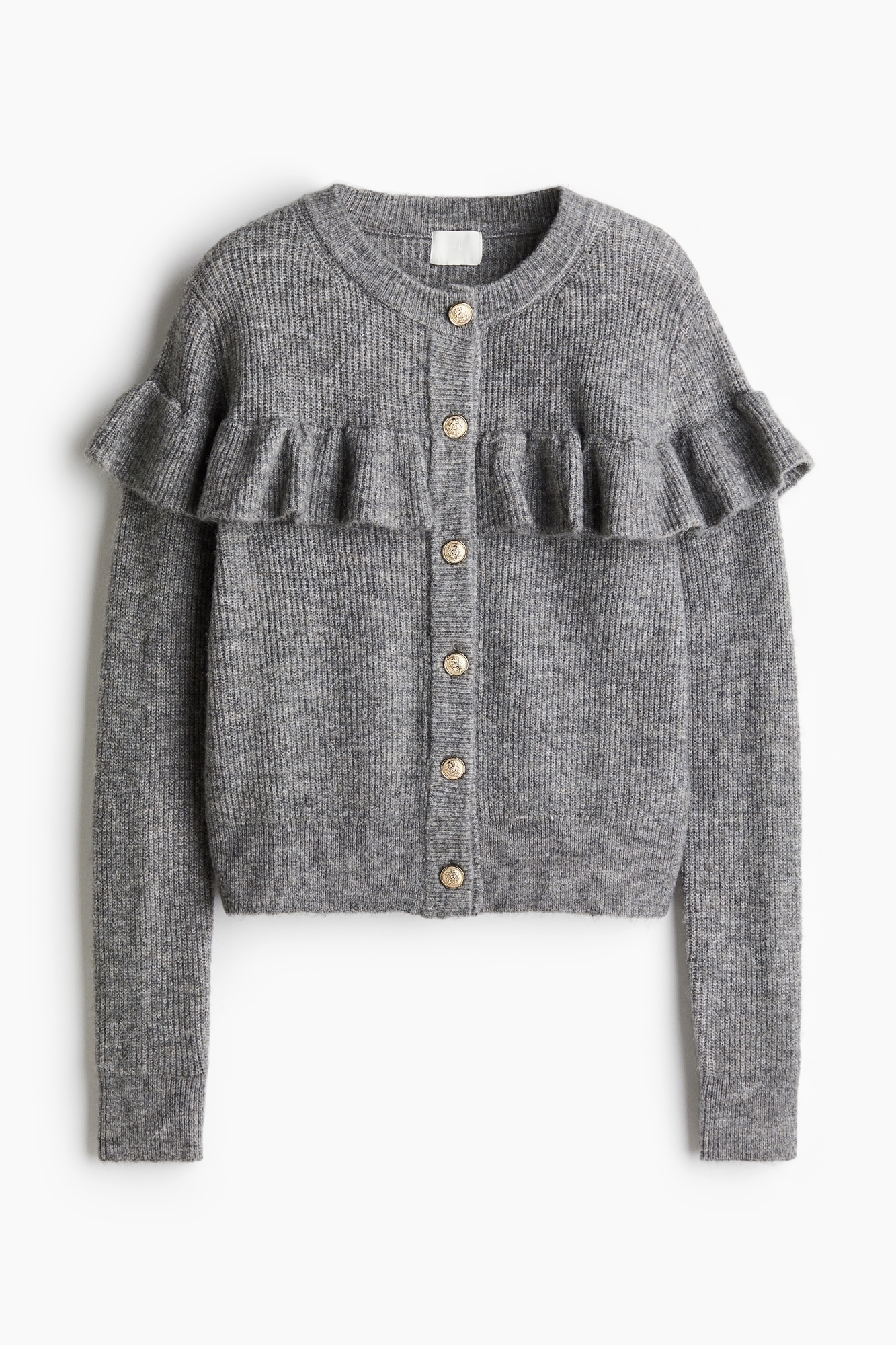 Кардиган с длинными рукавами из мягкого трикотажа в рубчик с круглым вырезом, металлическими пуговицами спереди и оборкой по верху и рукавам.