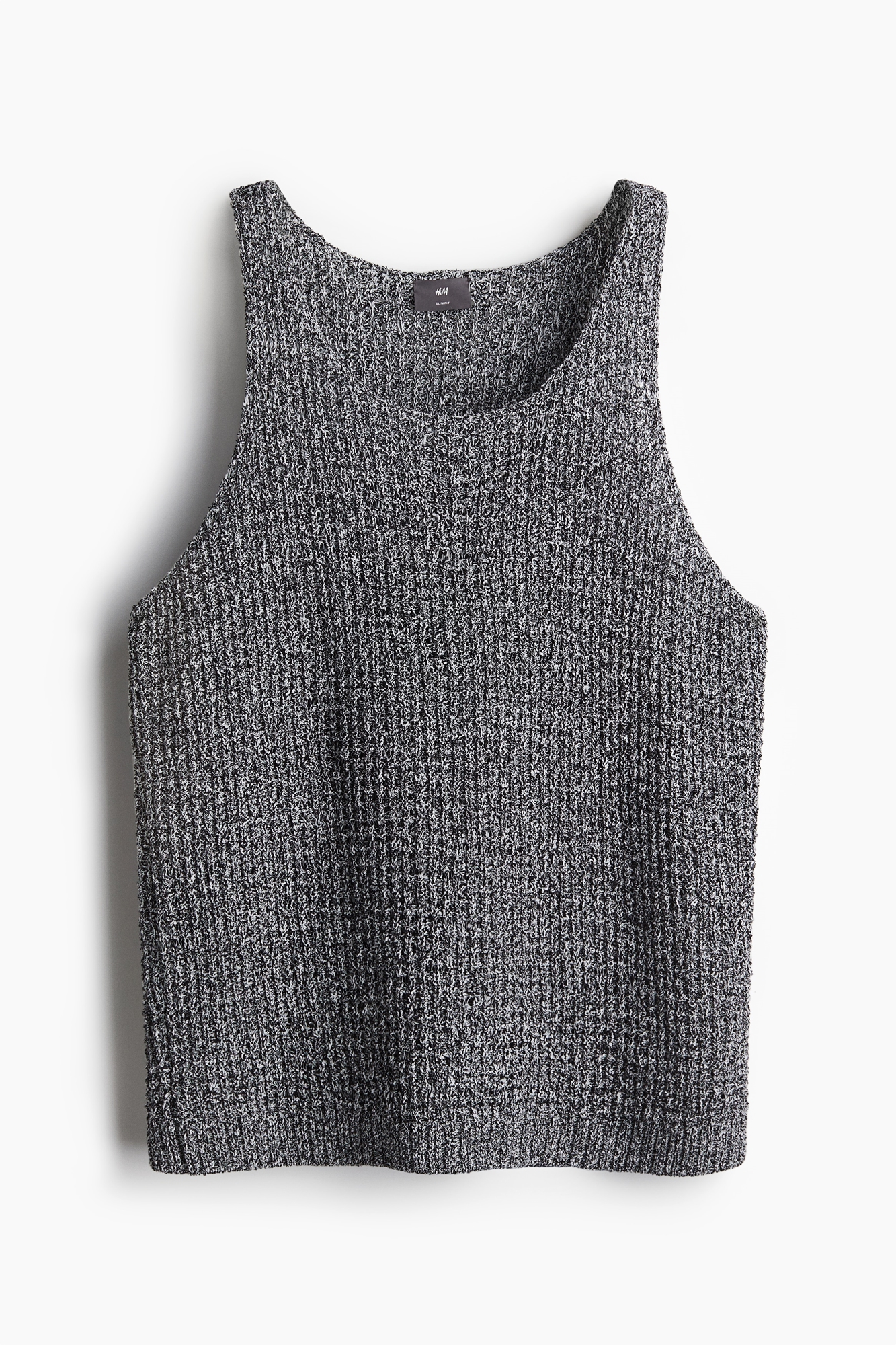 Жилет-топ из мягкого трикотажа с глубоким круглым вырезом спереди и прямым подолом. Зауженный крой, который облегает контуры тела, создавая приталенный силуэт.