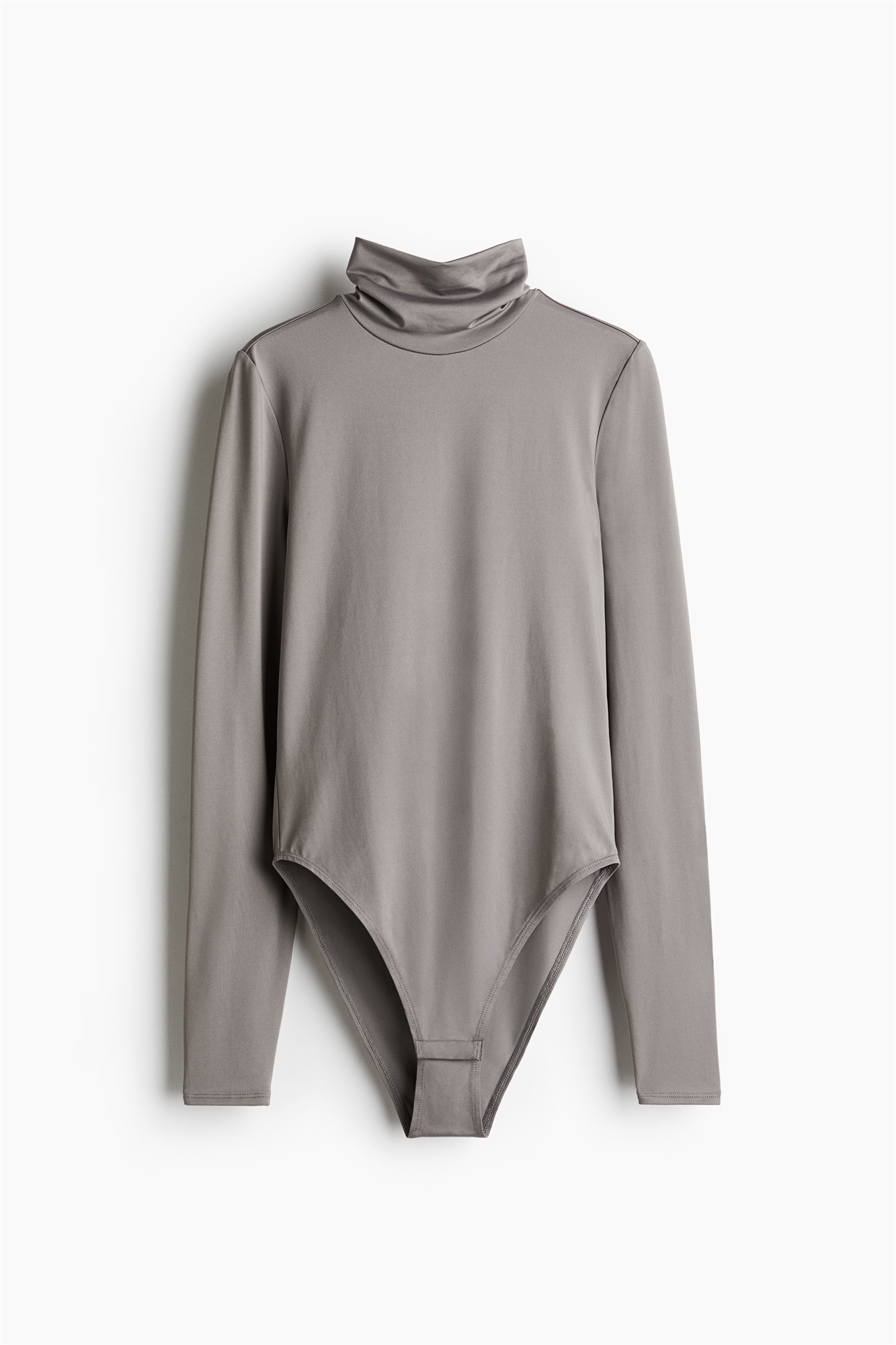 Боди из эластичного трикотажа с горловиной поло, длинными рукавами и потайными кнопками в области промежности.
