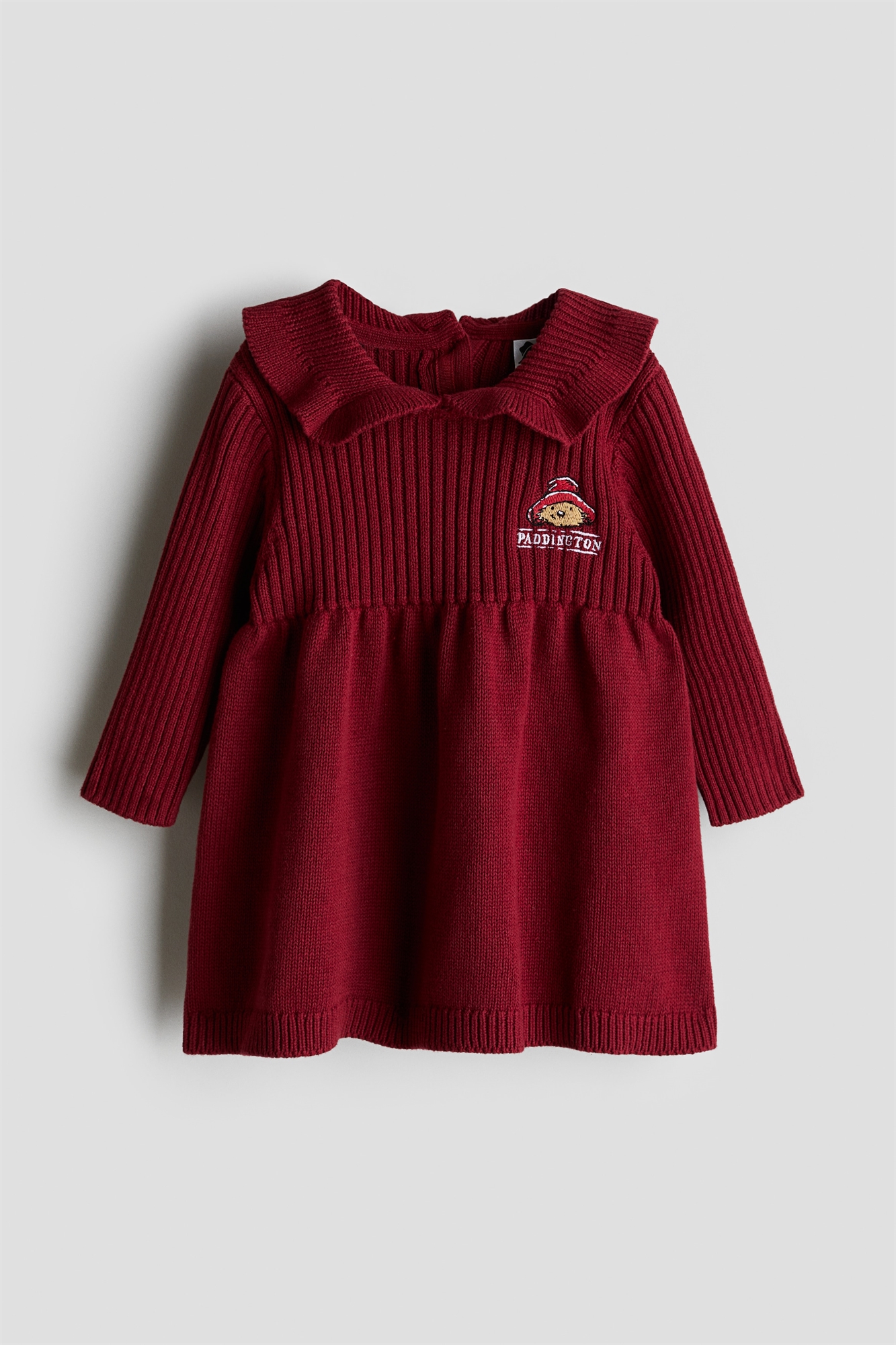 Платье из мягкого хлопка с ребристой вязкой и вышитой аппликацией спереди. Отложной воротник, пуговицы сзади и длинные рукава. Юбка из тонкого трикотажа с ребристым подолом.