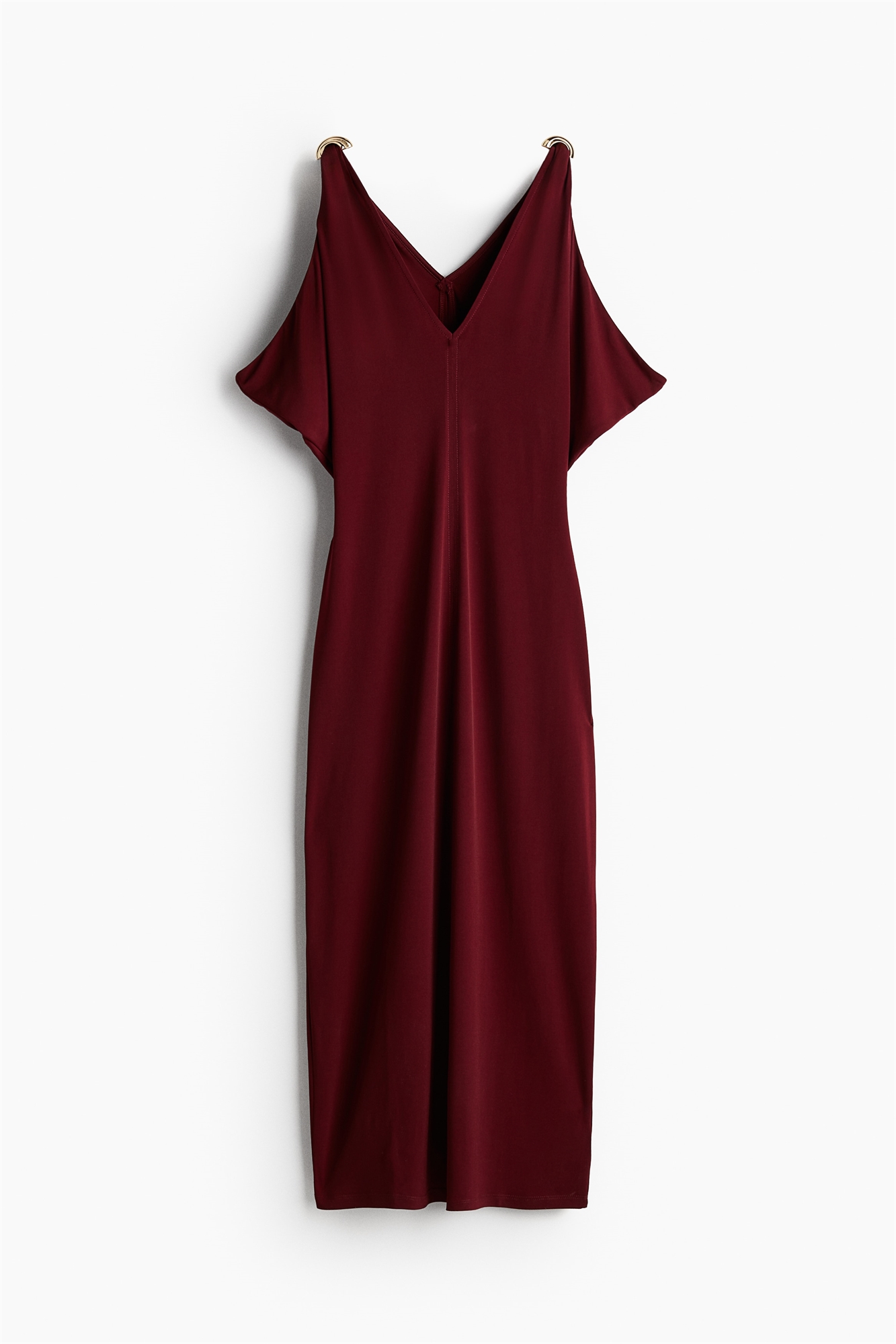 Приталенное платье длиной до колен из мягкого джерси с глубоким V-образным вырезом спереди и сзади, драпировкой по всей длине и широкими бретелями с блестящей деталью сверху.