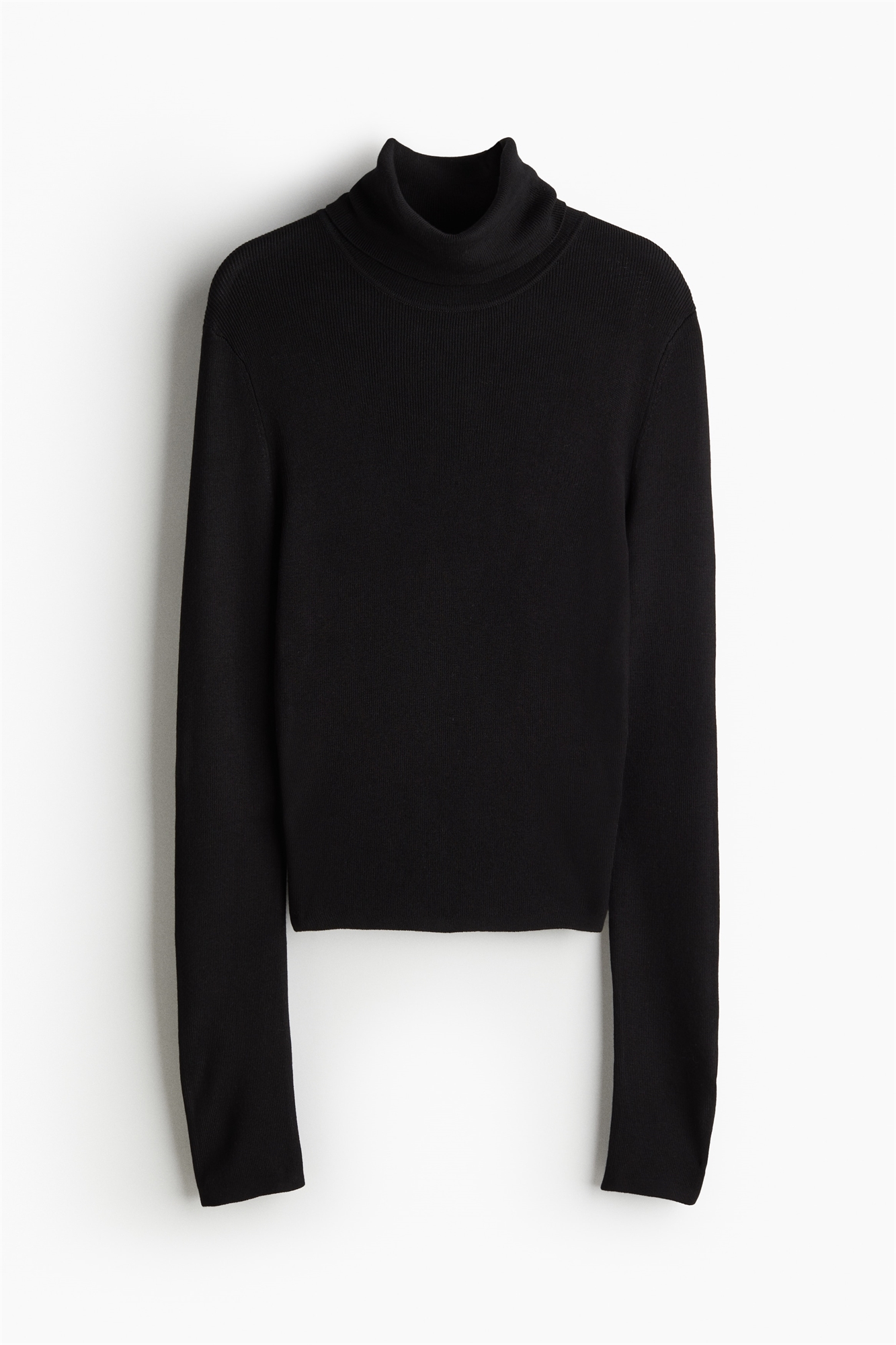 Короткий приталенный топ из тонкой вискозной ткани в рубчик с горловиной поло, длинными рукавами и прямым подолом.