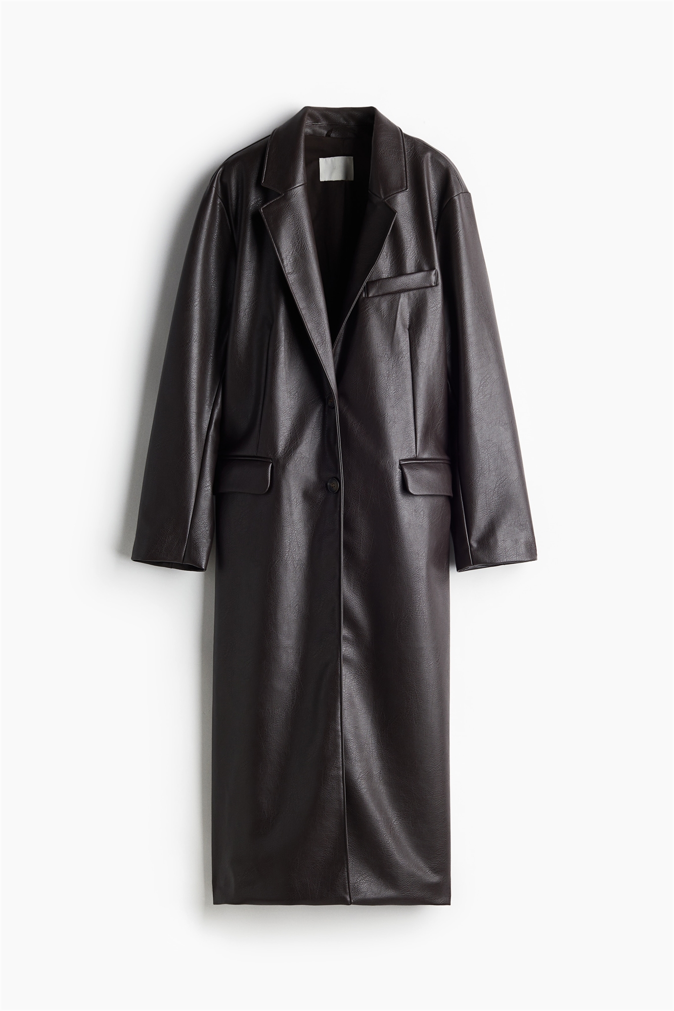 Пальто оверсайз из мелованной ткани с лацканами с вырезом и пуговицами спереди. Накладной карман на груди, втачные передние карманы с клапаном и один задний вентиляционный проем. На подкладке.