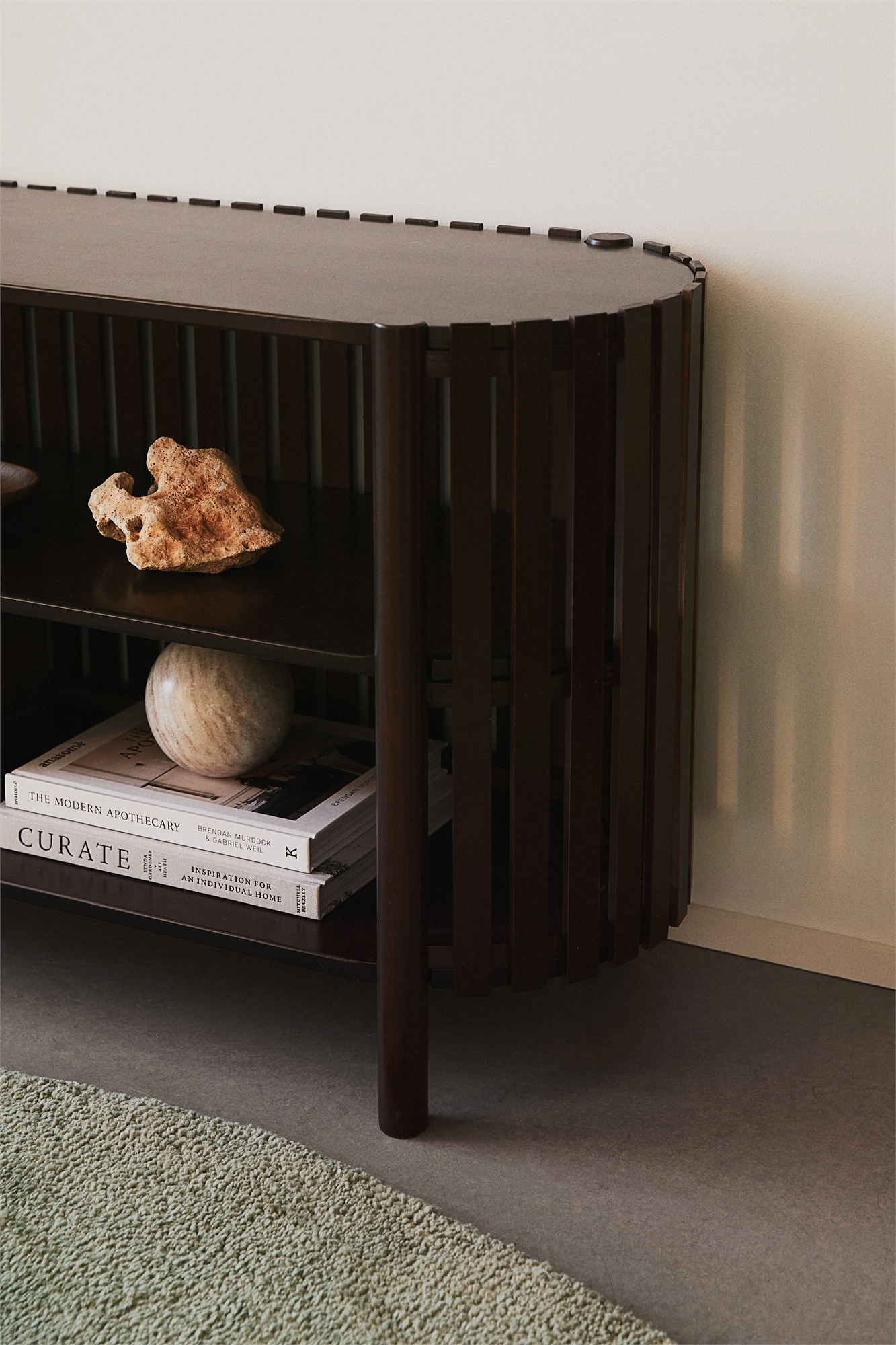 Консольный столик из МДФ и соснового дерева, предназначенный для установки у стены, не нарушая естественного ритма комнаты. Имеет две прочные полки и четыре ножки. Закрыт тонкими деревянными панелями, что придает ему чистый, современный вид. Глубина 35,5 см. Высота 55,7 см. Ширина 100 см.