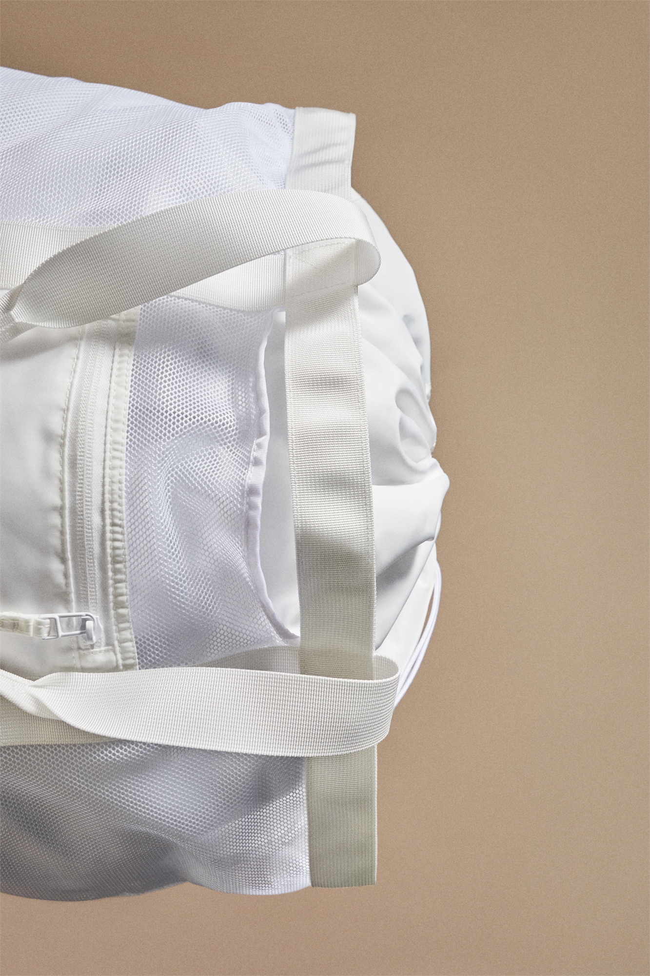 Спортивная сумка из сетки с ручками и внешним отделением на молнии. В ней есть внутренний чехол из тканого материала с завязкой в верхней части и внутренним отделением на молнии. Чехол легко снимается и крепится с помощью кнопок.