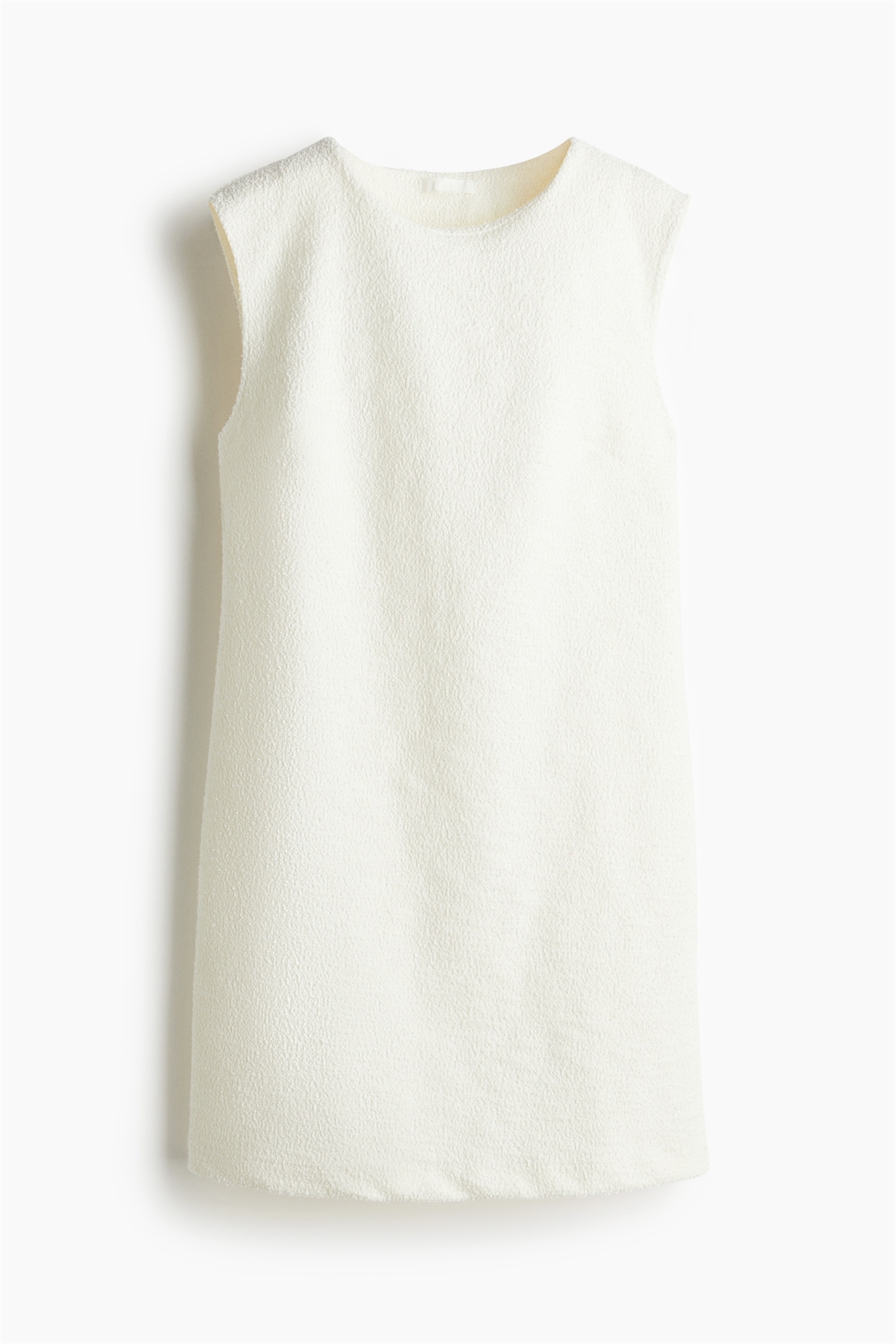 Короткое платье без рукавов из мягкого трикотажа букле с круглым вырезом, нагрудными вытачками и прямым покроем.