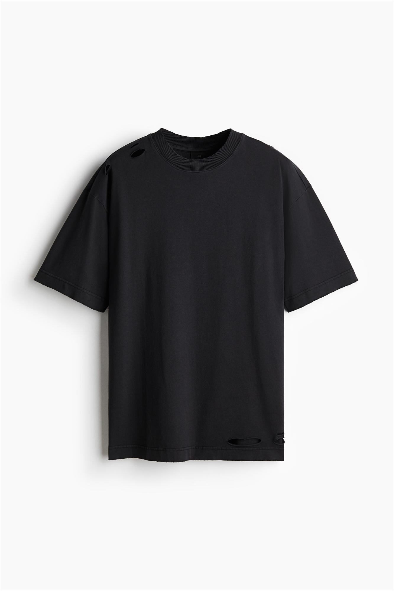 Состаренная футболка из хлопкового джерси средней плотности с поношенными деталями. С ребристой отделкой горловины, спущенными плечами и прямым подолом. Свободный крой для непринужденного мешковатого стиля.