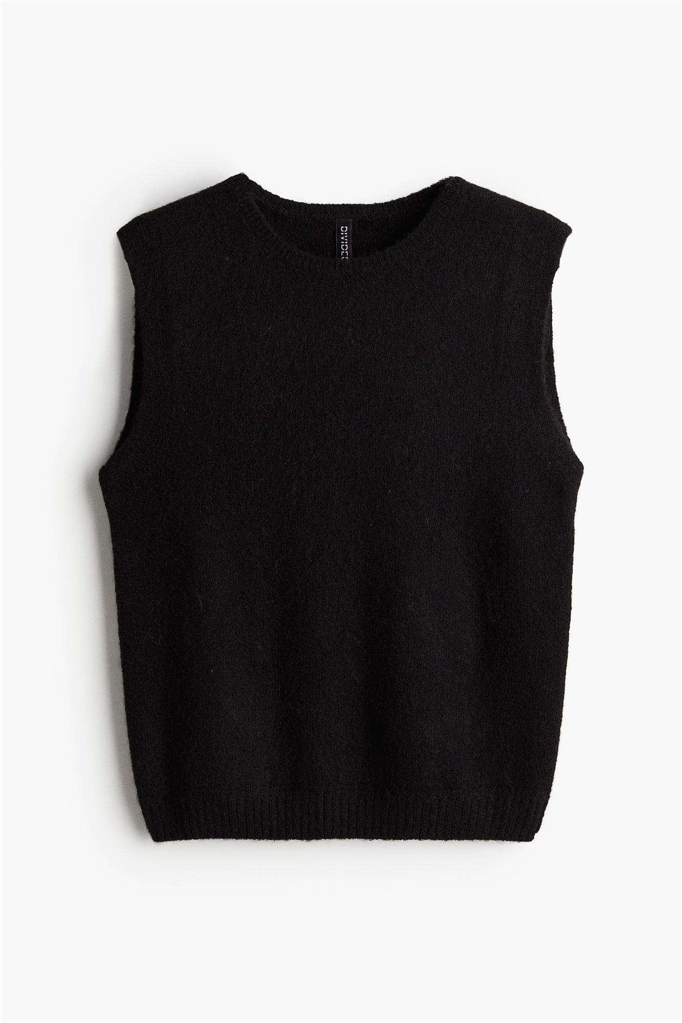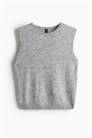 Короткий свитер-жилет из мягкого трикотажа с круглым вырезом, отделанным ребрами, и тесемками по подолу.