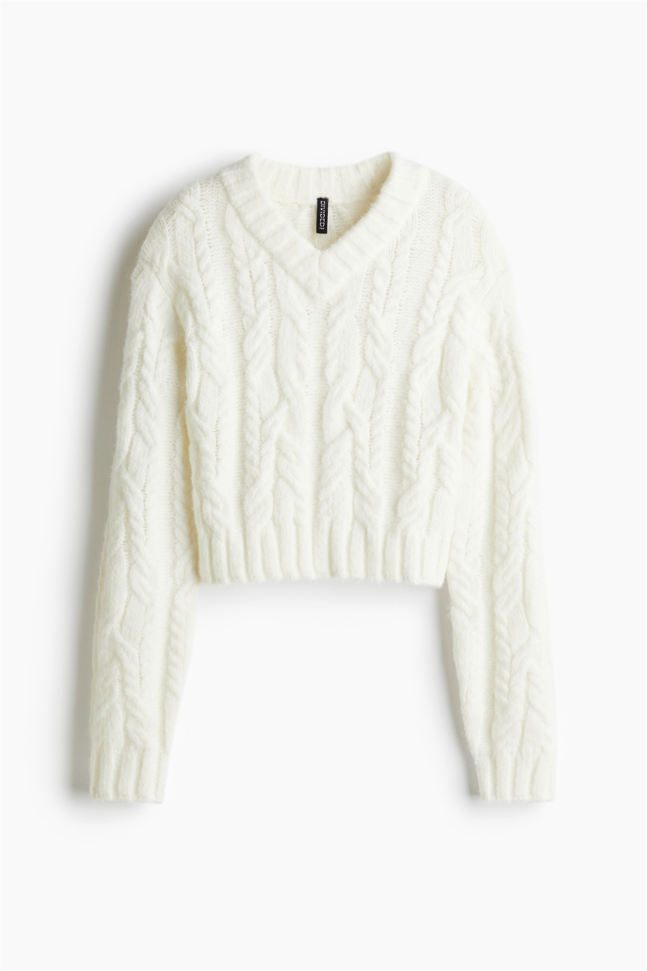 Короткий джемпер из мягкого кабельного трикотажа с ребристым V-образным вырезом, спущенными плечами и длинными рукавами. Ребристые манжеты и подол.