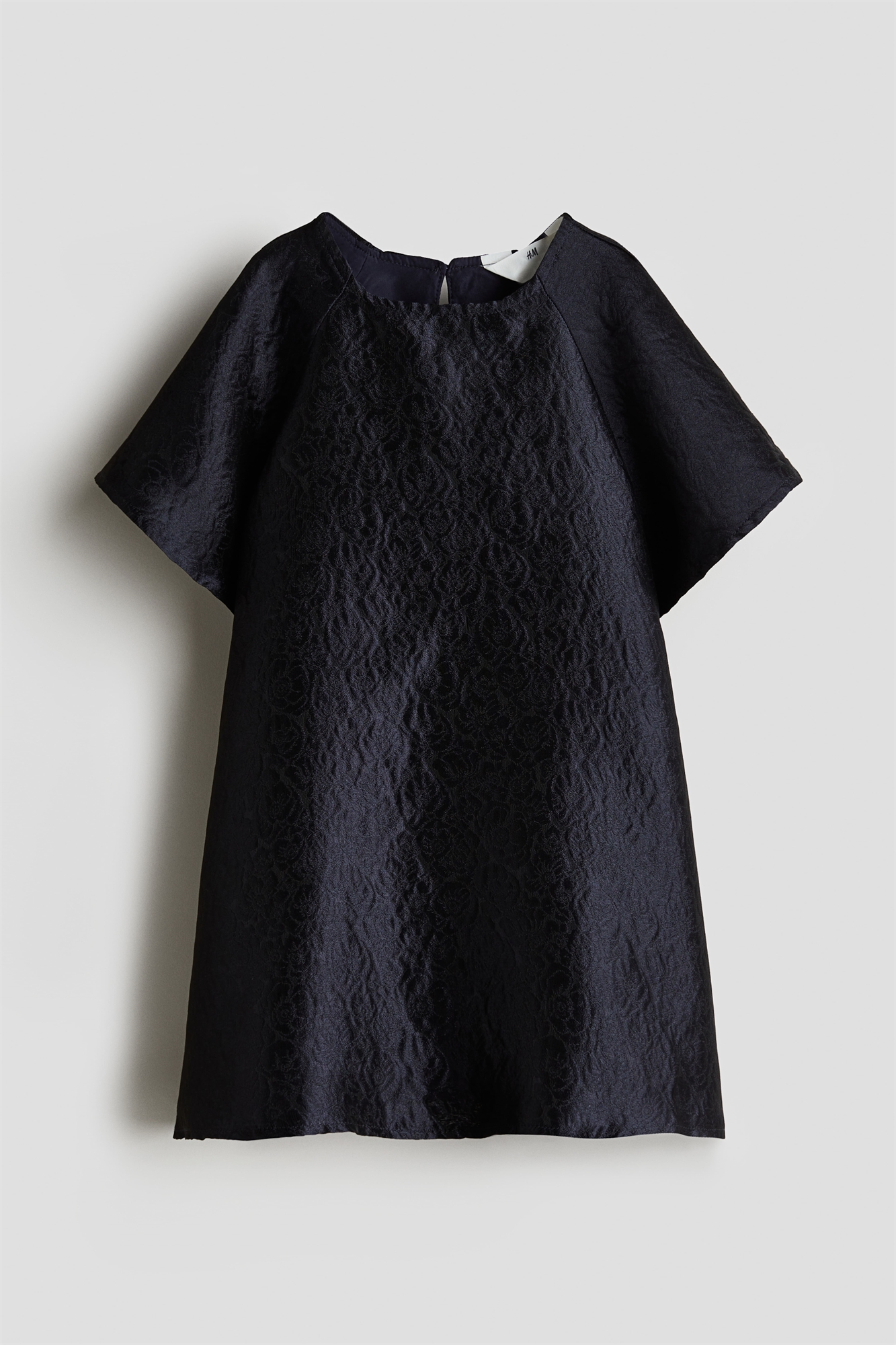 Платье А-линии из прочного, переливающегося жаккардового переплетения. Круглый вырез, короткие рукава реглан и отверстие для ключа с пуговицей сзади. На подкладке.
