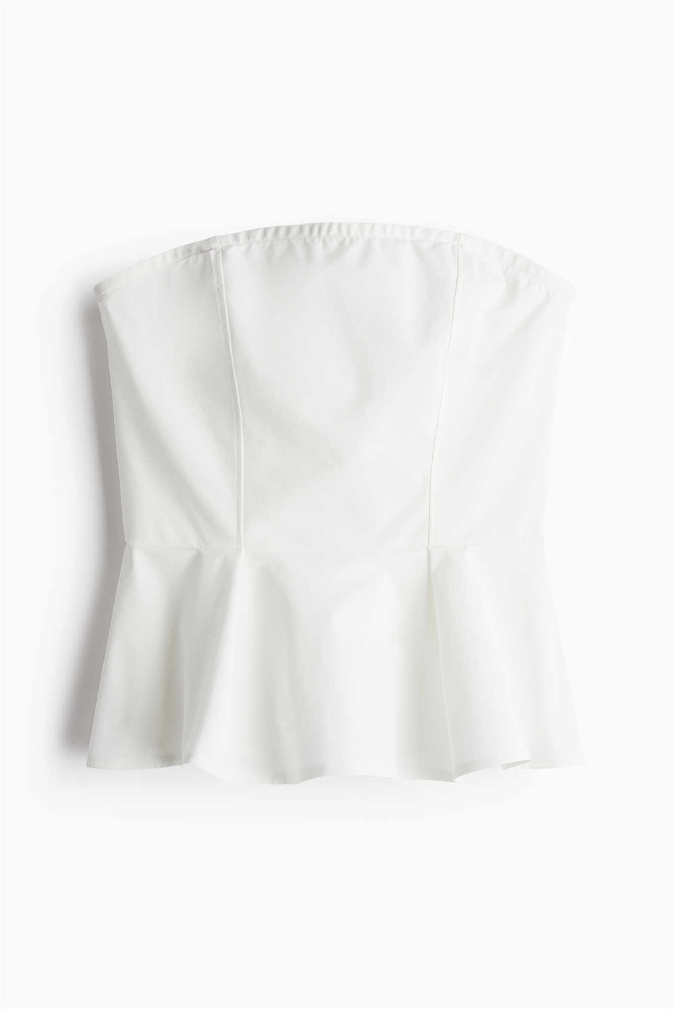 Облегающий топ-бандо из джерси со скрытой силиконовой отделкой спереди и узкой резинкой сзади. Шов на талии и расклешенный пеплум со складками спереди.