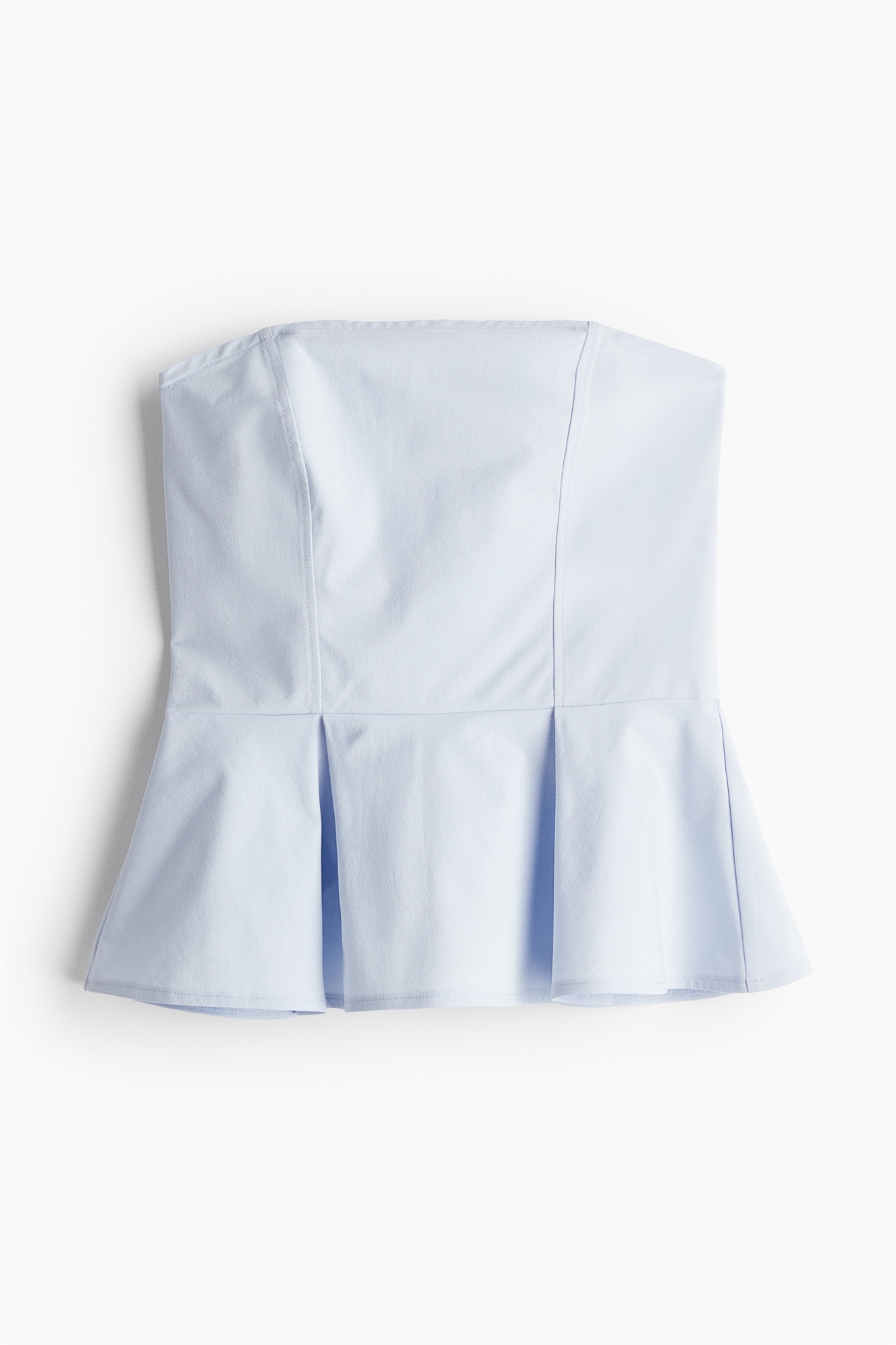 Облегающий топ-бандо из джерси со скрытой силиконовой отделкой спереди и узкой резинкой сзади. Шов на талии и расклешенный пеплум со складками спереди.