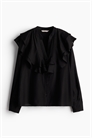 Блузка из тканого материала с воротником-бантом, V-образной проймой и пуговицами спереди. Длинные рукава с манжетами на пуговицах и широкие двойные воланы вокруг выреза, переходящие на плечи и спину.