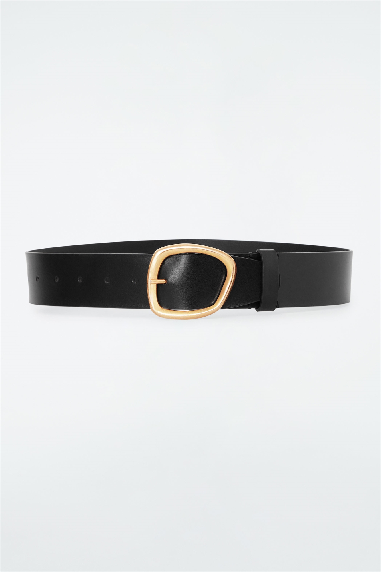Этот современный ремень из эластичной черной кожи имеет широкую форму и асимметричную пряжку золотого цвета. Оберните его вокруг талии платья или тренча. Застежка-пряжка COS поддерживает ответственное производство через Leather Working Group Материал: 100% кожа. Без учета отделки