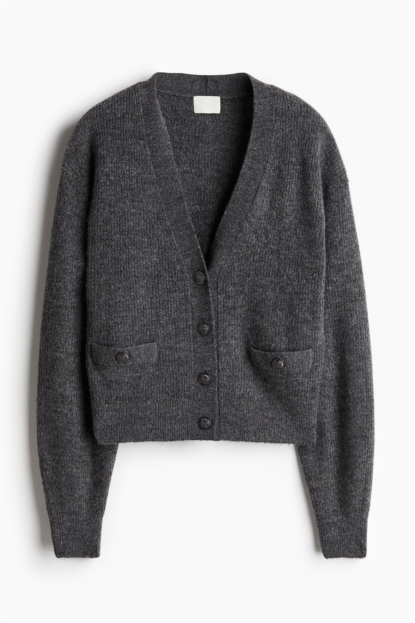 Свободный кардиган из мягкого трикотажа в рубчик с глубоким V-образным вырезом, пуговицами спереди и втачными карманами с пуговицей спереди. Спущенные плечи и длинные зауженные рукава с облегающими манжетами.