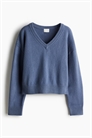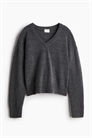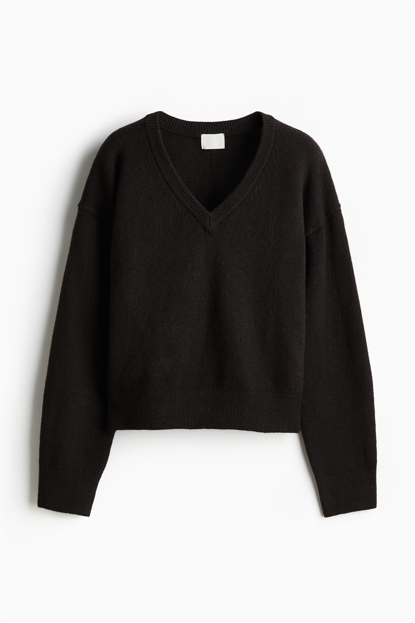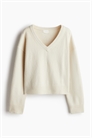 Джемпер свободного кроя из мягкого трикотажа с глубоким V-образным вырезом, спущенными плечами и длинными рукавами. Окантовка вокруг выреза, на манжетах и подоле.