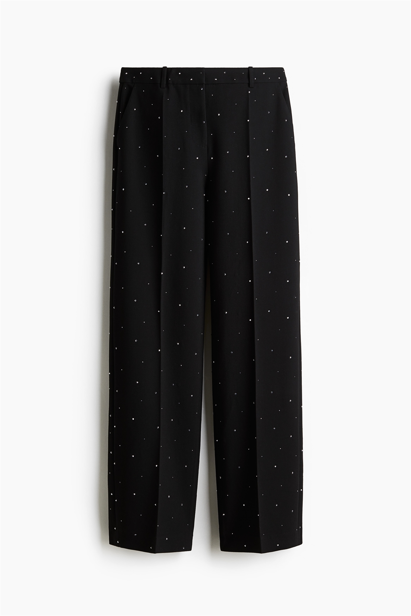 Приталенные украшенные брюки со скрытой эластичной резинкой на талии и ширинкой на молнии с застежкой на крючок и планку. Диагональные боковые карманы, втачные карманы сзади и прямые ноги со складками спереди и сзади.