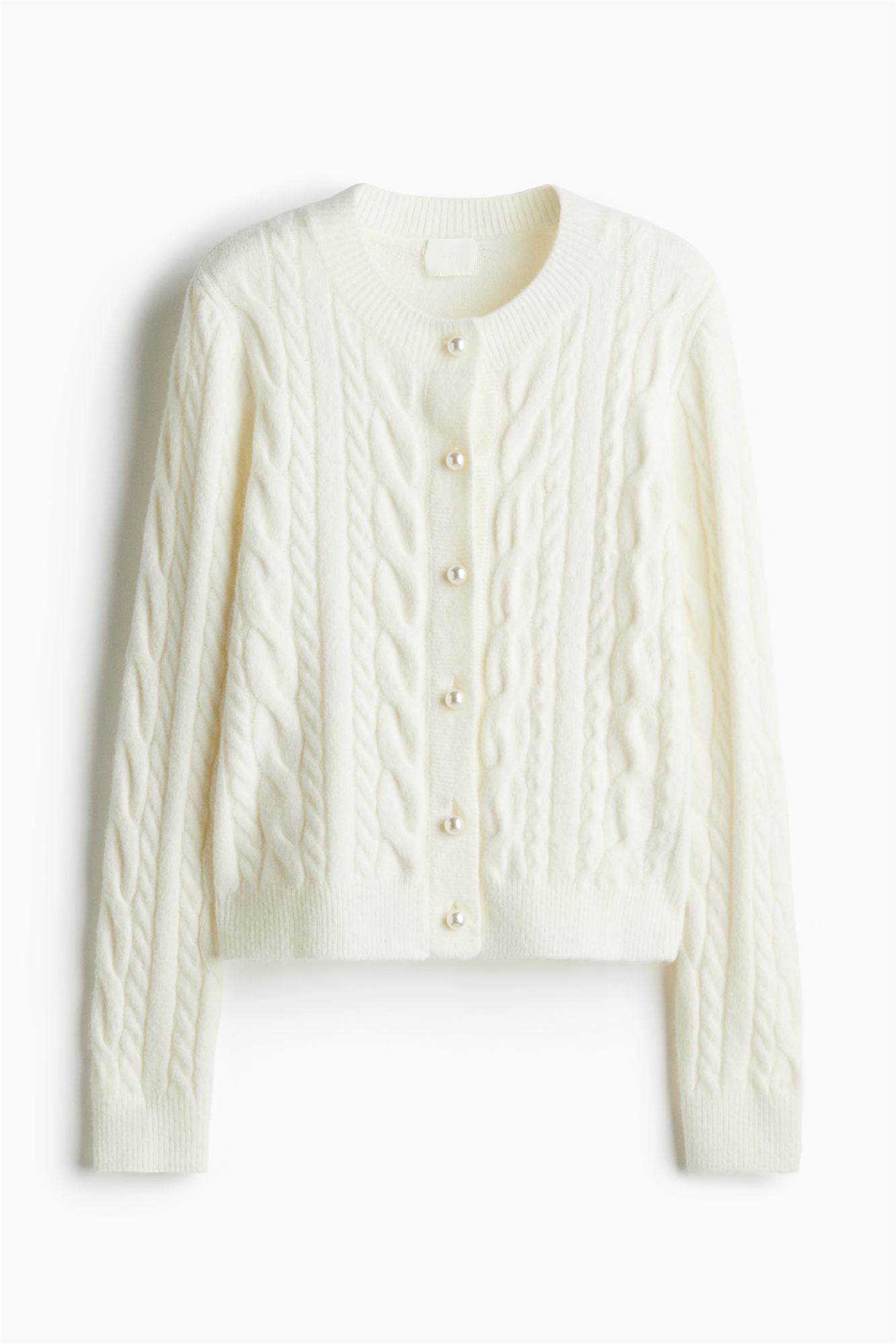 Свободный кардиган из мягкого трикотажа в рубчик с гладкой спинкой. Круглый вырез, перламутровые пуговицы спереди и длинные рукава.