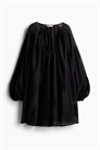Короткое платье свободного покроя из воздушной ткани с декоративной вышивкой. V-образный вырез со складками и длинные, объемные рукава реглан с узкой резинкой на манжетах. Без подкладки.
