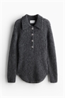 Слегка удлиненный джемпер из мягкого трикотажа в рубчик с мохером и шерстью. Воротник, украшенные стразами пуговицы в верхней части и длинные рукава. Закругленный подол.