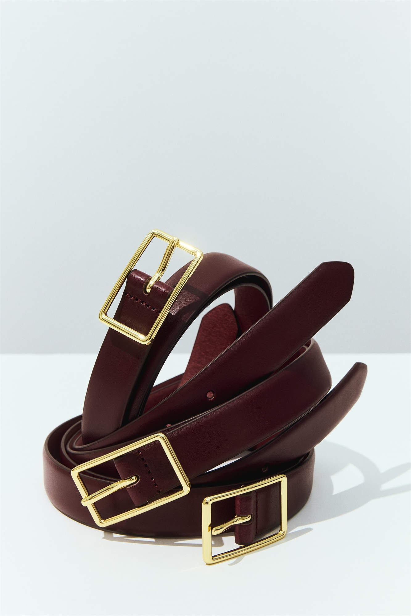 Кожаный ремень с квадратной металлической пряжкой. Ширина 2,5 см.