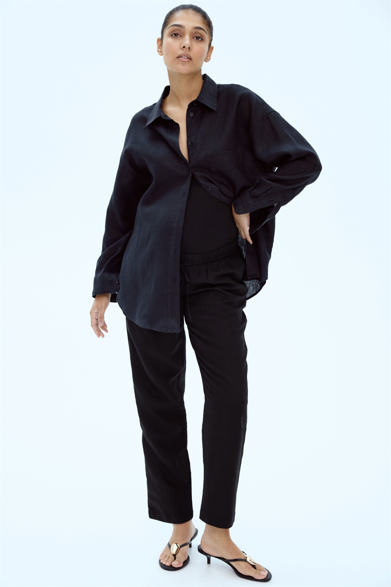 Брюки из льна и вискозы с эластичной отделкой и узким шнурком на талии. Диагональные боковые карманы и зауженные ноги длиной до щиколотки. Широкая панель из джерси на талии для лучшей посадки на животе.