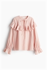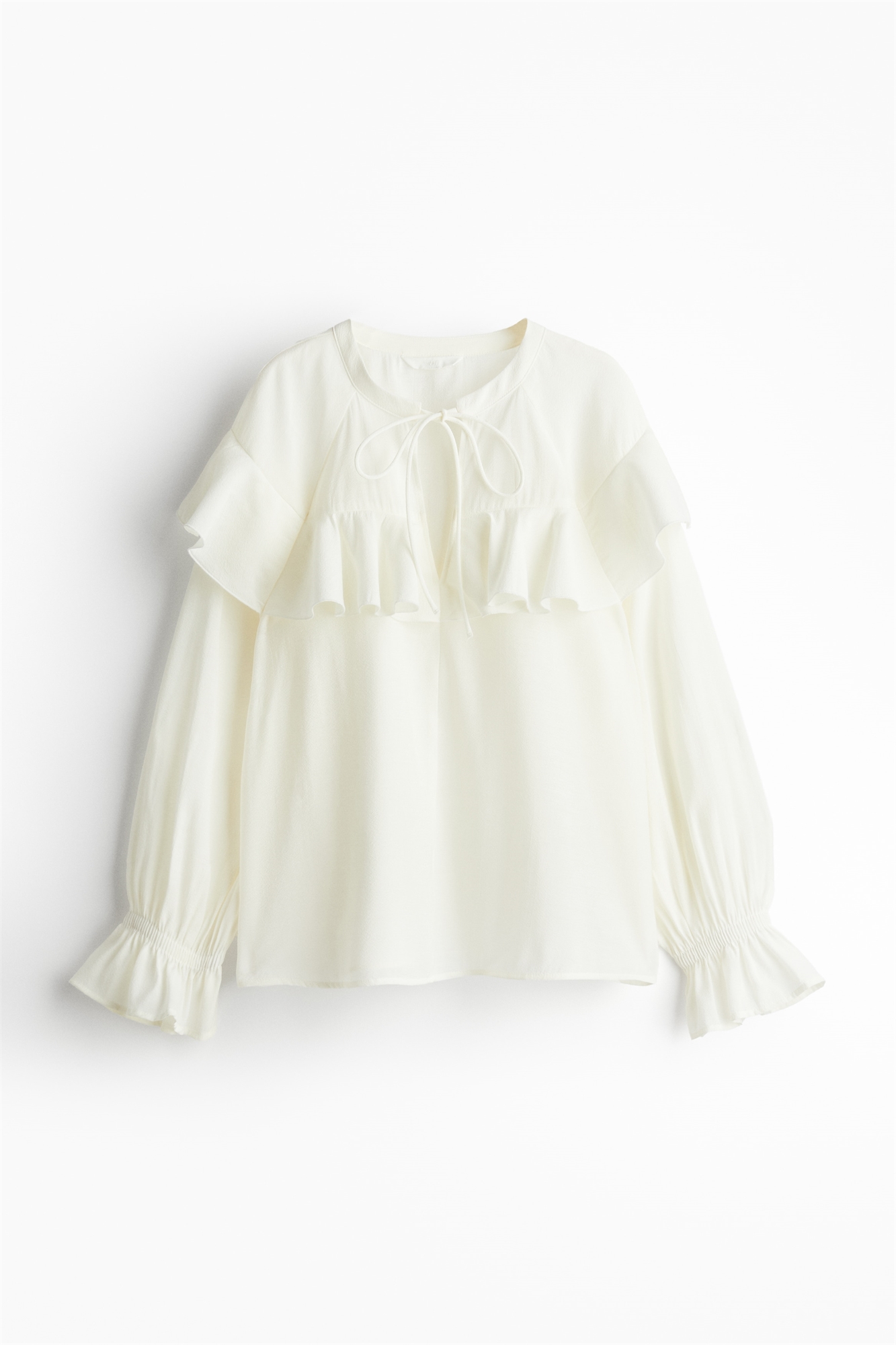 Блузка из тканого материала с воротником-бантом, проймой с завязками-спагетти спереди и широкой отделкой воланами на груди и рукавах. Длинные рукава реглан с эластичной отделкой и воланом на манжетах.