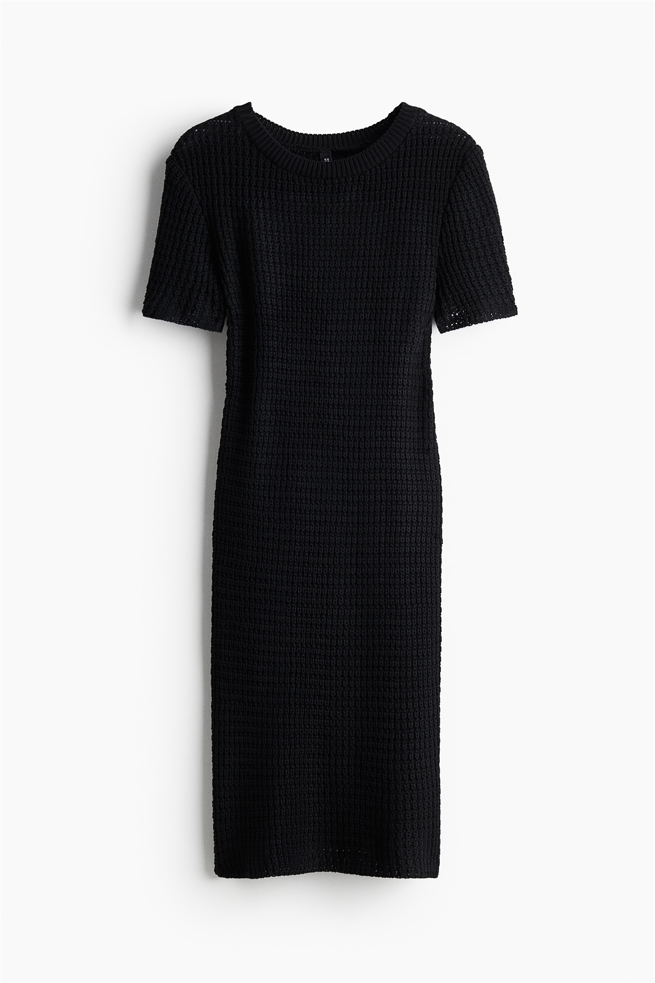 Короткое приталенное платье из мягкого трикотажа с круглым вырезом и короткими рукавами.