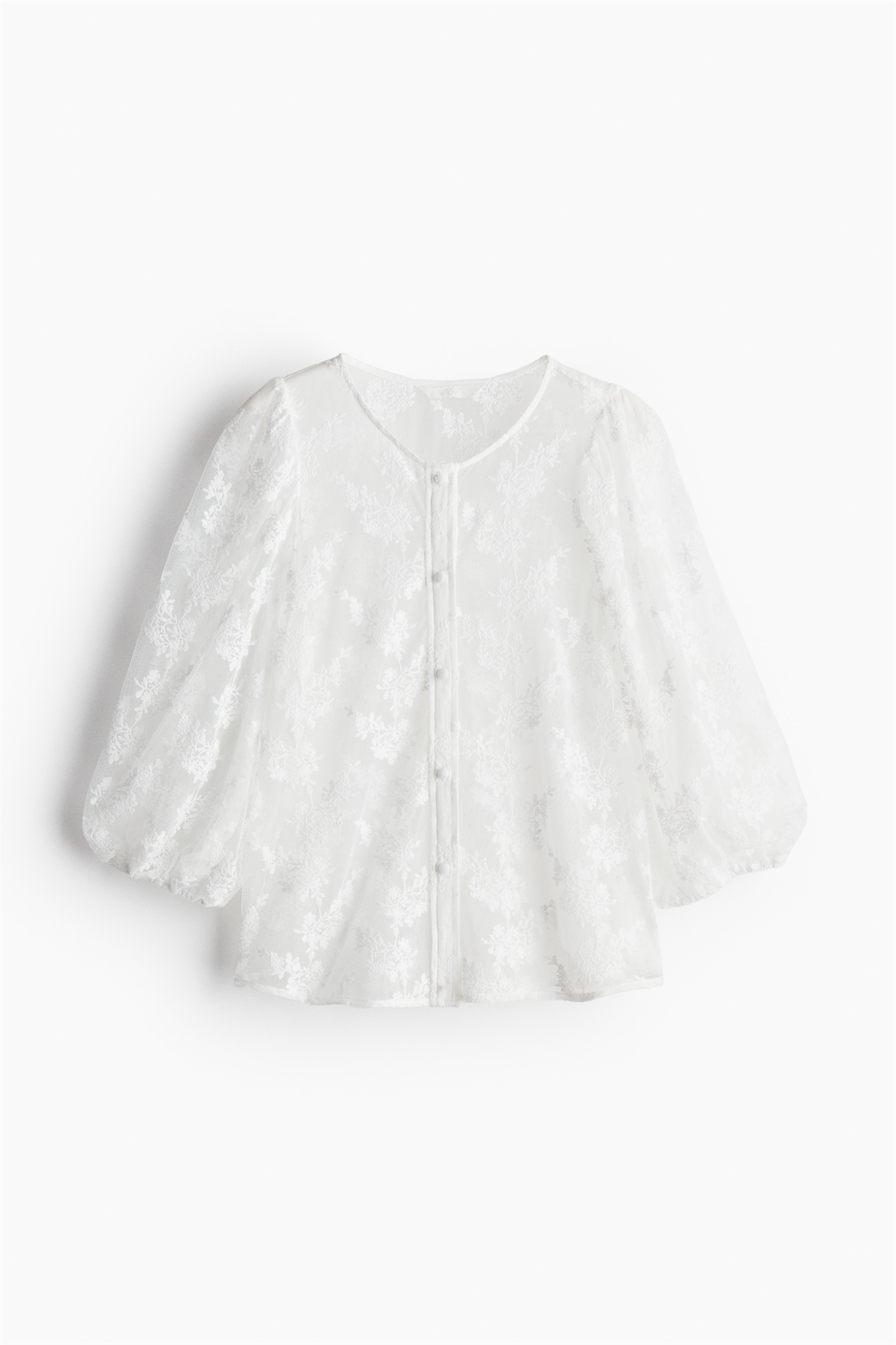 Воздушная кружевная блузка с круглым вырезом, застежкой на пуговицы и рукавами-баллонами длиной 3/4 с эластичными манжетами. Без подкладки.
