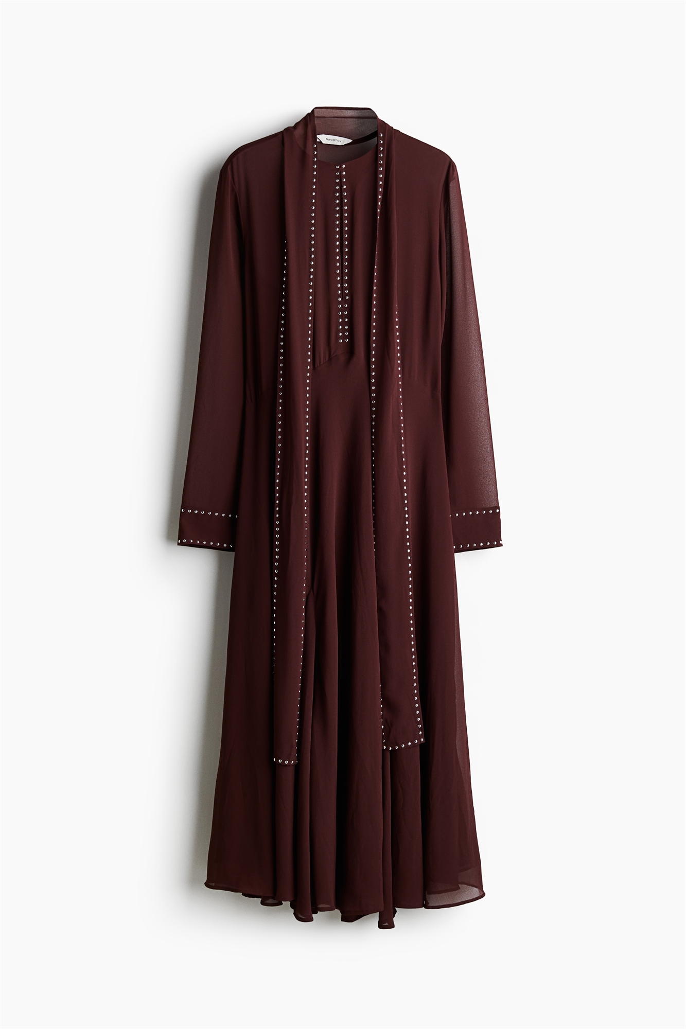Платье длиной до колена из прозрачного шифона, украшенное шипами серебряного цвета. Круглый вырез с длинными завязками, напоминающими шарф, которые можно укладывать по-разному. Глубокая пройма спереди с потайной застежкой-крючком и длинными рукавами с манжетами. Угловой шов на талии, потайная застежка-молния с одной стороны и расклешенная юбка с V-образными вставками для придания объема. Частично на подкладке.