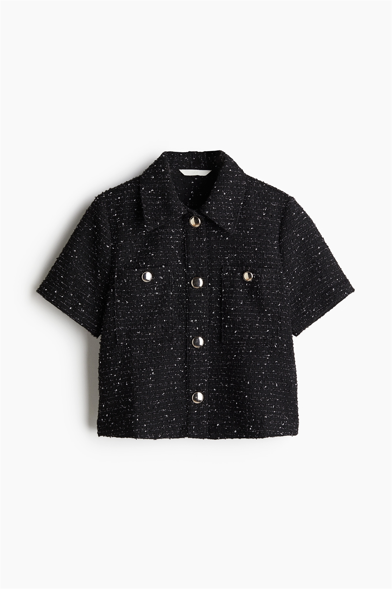 Короткая рубашка из ткани букле с воротником и металлическими пуговицами спереди. Короткие рукава и накладные нагрудные карманы с пуговицей.