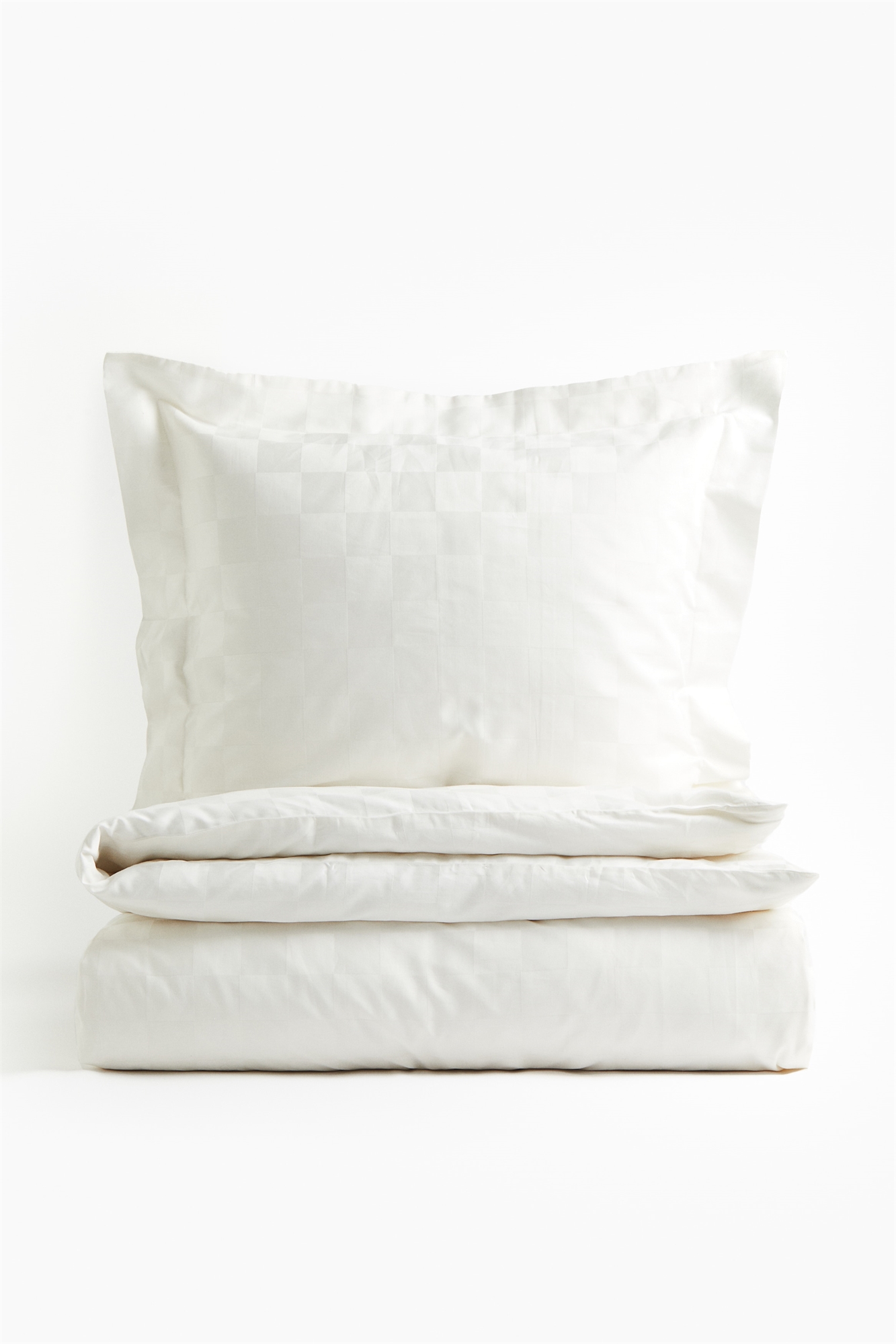 Односпальный комплект пододеяльников из хлопкового сатина жаккардового переплетения с тонким нитевым рисунком и количеством нитей 210. Пододеяльник застегивается снизу на потайные пластиковые пуговицы. Одна наволочка с отверстием для конверта.