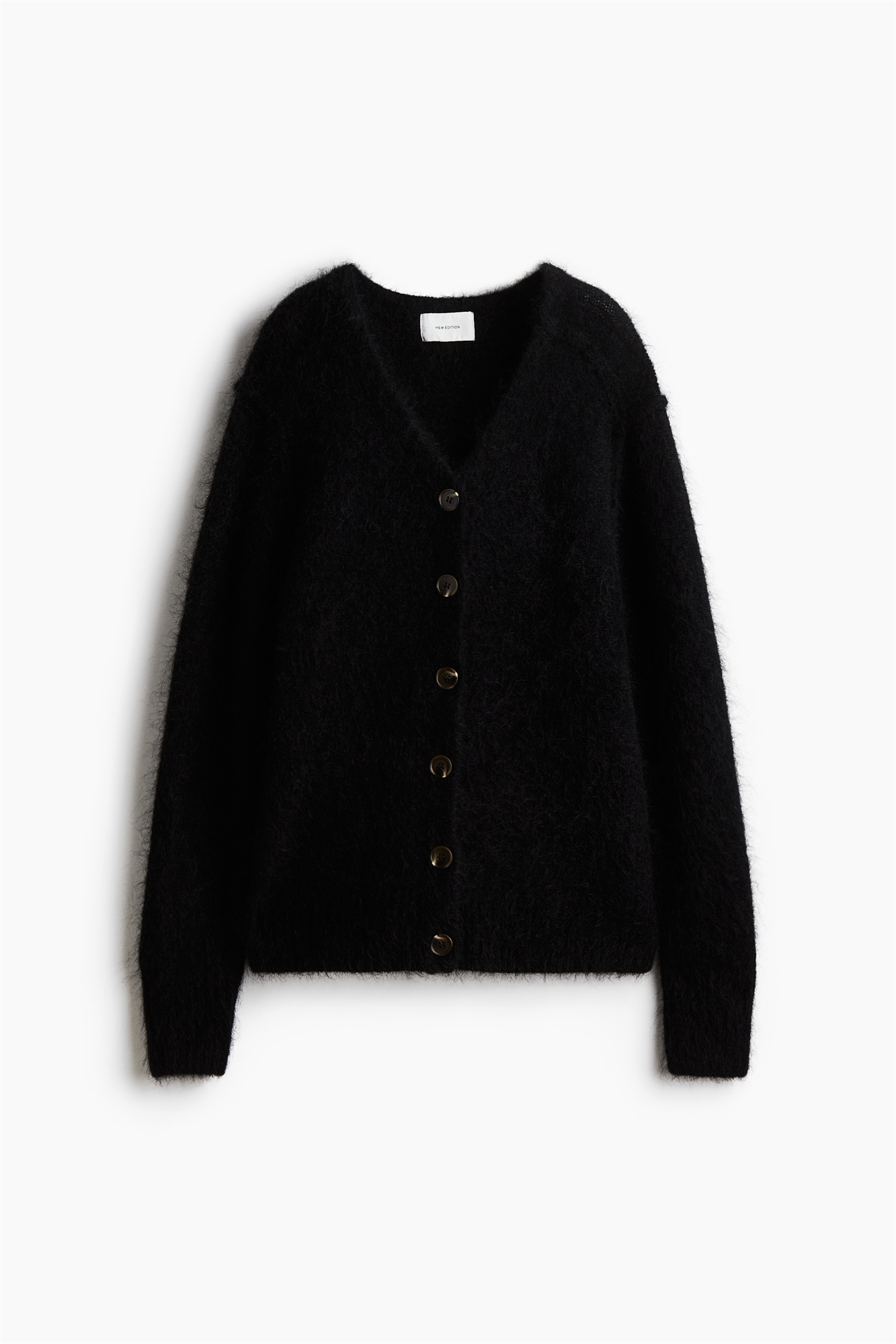 Кардиган из мягкого, пушистого трикотажа с содержанием мохера и шерсти. V-образный вырез, пуговицы спереди, спущенные плечи и длинные рукава. С открытыми швами, манжетами и подолом в рубчик.