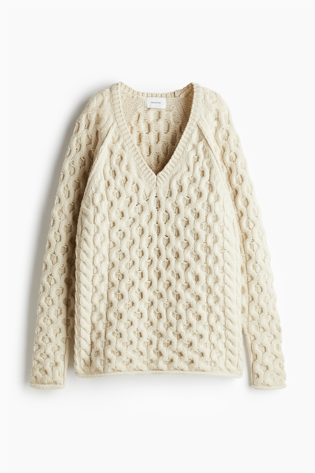 Джемпер оверсайз из шерсти с глубоким V-образным вырезом и длинными рукавами реглан. Манжеты и подол с окантовкой.
