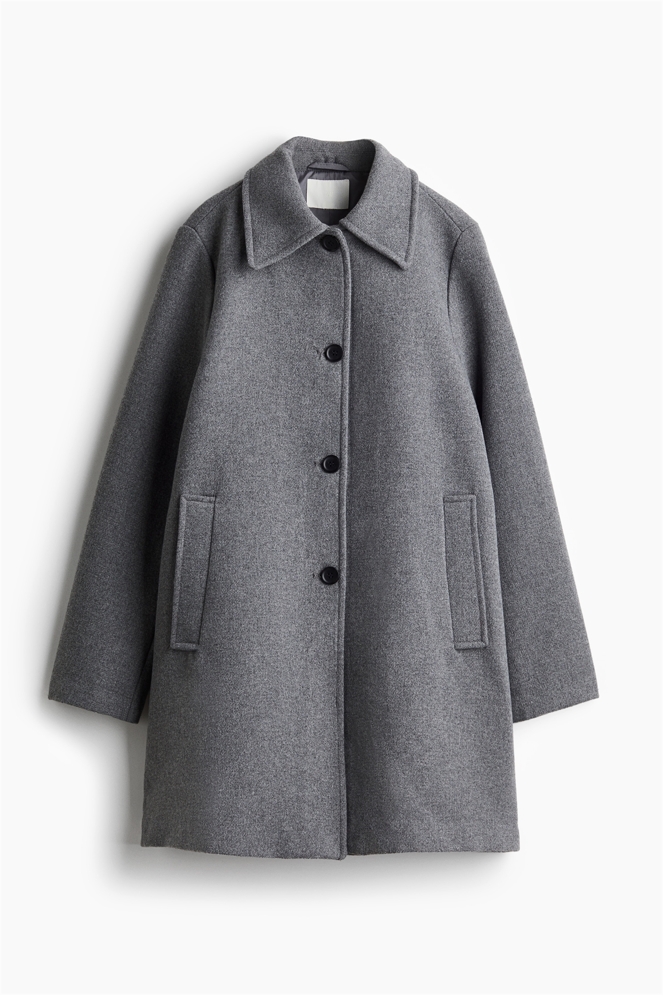 Пальто свободного покроя длиной до колена из войлока с воротником, пуговицами спереди и втачными боковыми карманами. На подкладке.