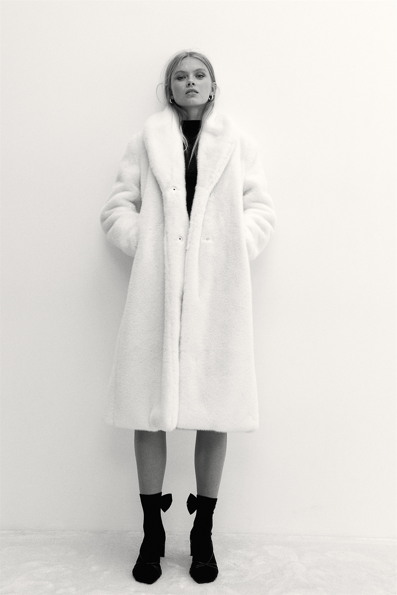 Пальто длиной до колена из мягкой пушистой ткани с шалевым воротником, скрытыми кнопками спереди и незаметными боковыми карманами. На подкладке.