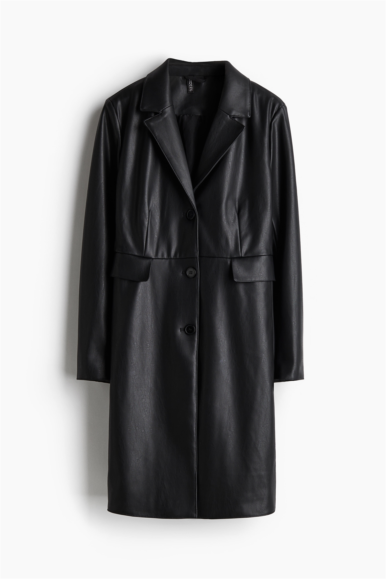 Однобортное пальто длиной до колена из лакированной ткани с видимыми швами спереди и сзади. Лацканы с вырезом, пуговицы спереди и накладные передние карманы. На подкладке.