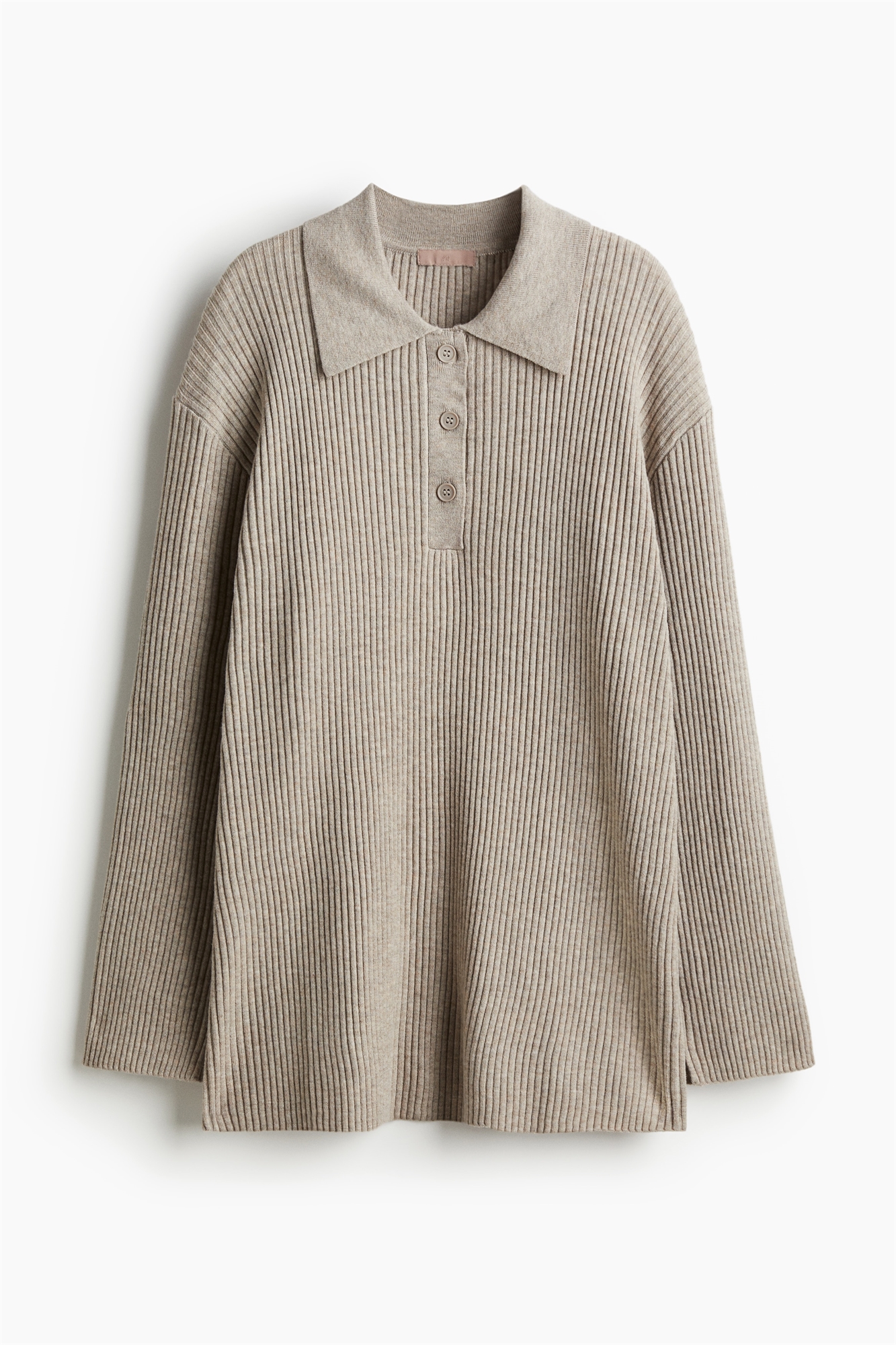 Длинная рубашка-поло свободного покроя из мягкого трикотажа в рубчик с воротником, застежкой на пуговицы и длинными рукавами с разрезом на манжетах. Прямой подол.