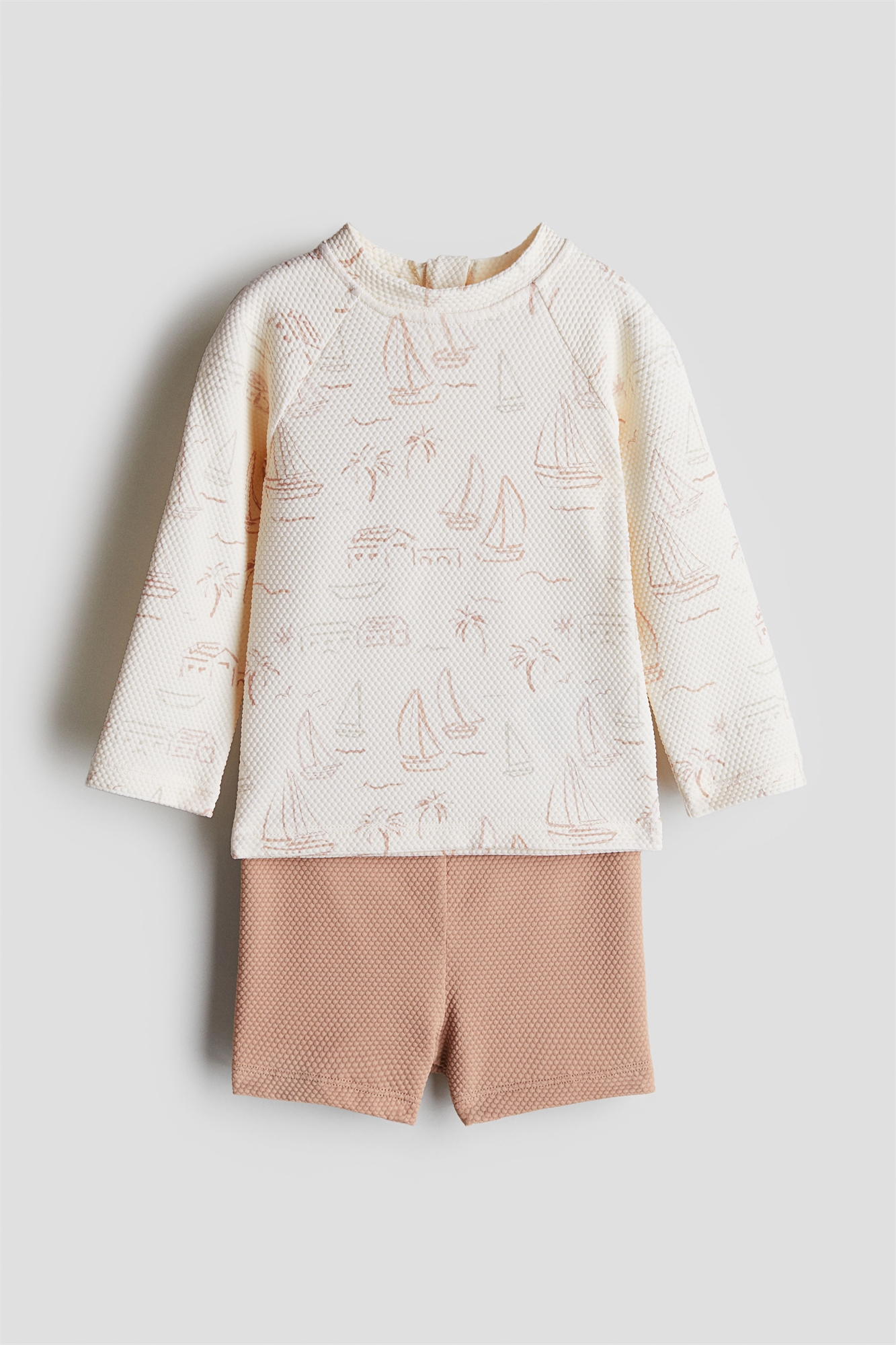H&M Adorables. Текстурированный комплект для плавания, состоящий из топа и плавок из ткани с защитой от ультрафиолета UPF 50. Топ с небольшим воротником-стойкой и застежкой-молнией сзади с защитой от натирания. Длинные рукава реглан минимизируют риск трения по швам. Шорты с частичной подкладкой и эластичным поясом.