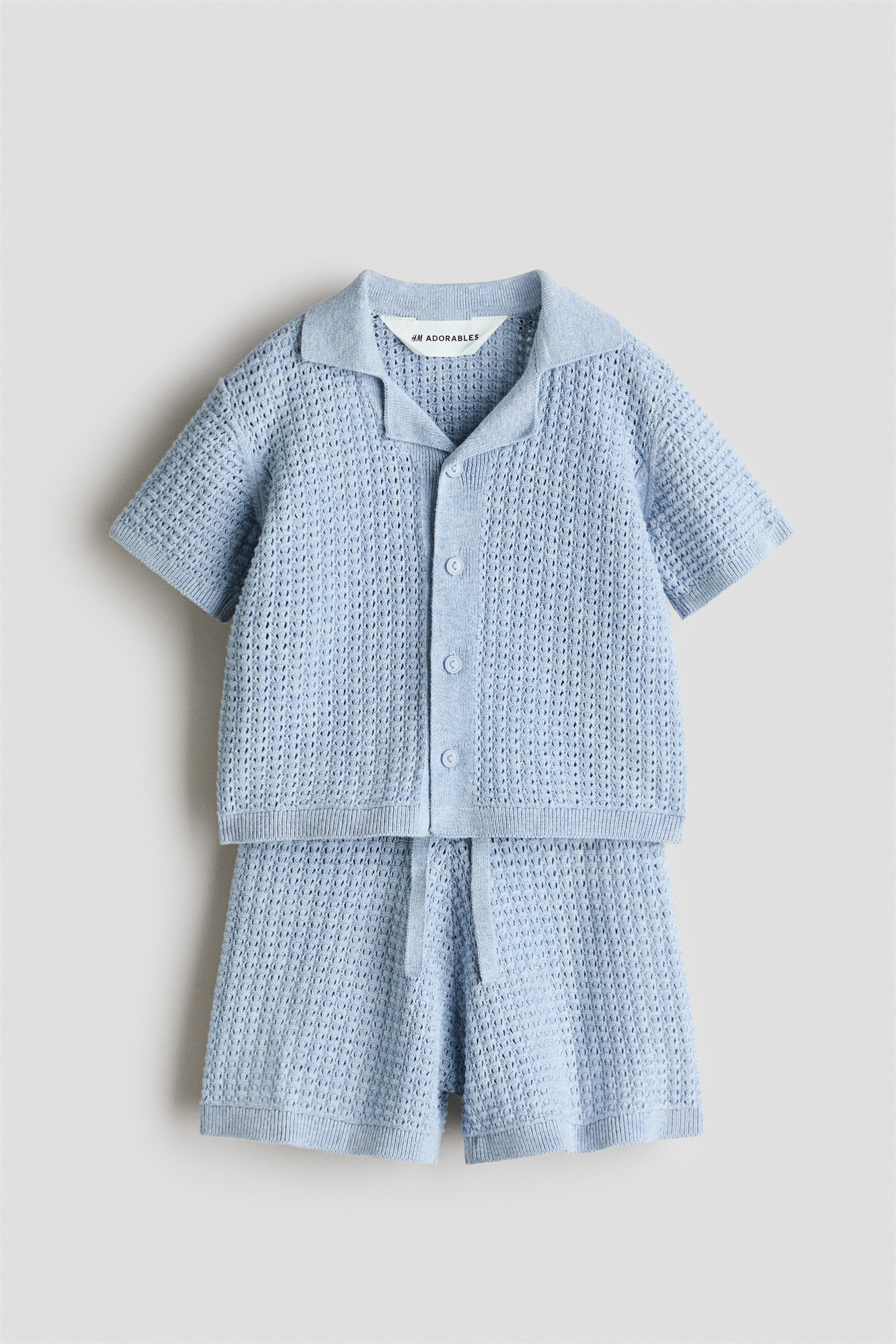 H&M Adorables. Комплект из курортной рубашки и пары шорт из мягкого трикотажа пуантель из высококачественного хлопка. Рубашка с короткими рукавами, воротником-стойкой из тонкой трикотажной ткани, пуговицами спереди, манжетами и подолом с мелкой тесьмой. Шорты с эластичной утягивающейся талией и ребристой отделкой по подолу. Коллекция H&M Adorables - это подборка удобных и качественных вещей, которые не подвластны времени.