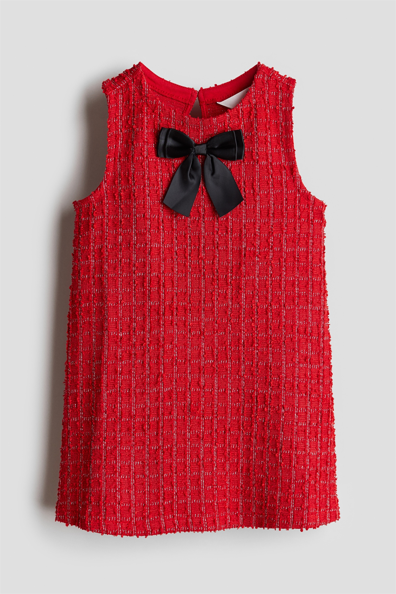 Платье из трикотажа букле с декоративным бантом спереди. Круглый вырез и отверстие для ключа с пуговицей сзади. Без подкладки.