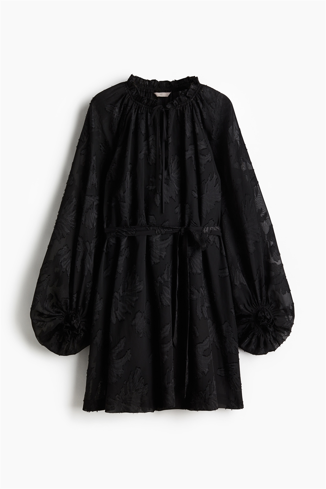 Короткое платье свободного кроя из жаккардового переплетения с оборчатым вырезом и V-образной проймой с завязками-спагетти спереди. Длинные рукава реглан-баллон с эластичными манжетами и съемным поясом-завязкой на талии. Нижнее платье с V-образным вырезом и узкими бретелями.